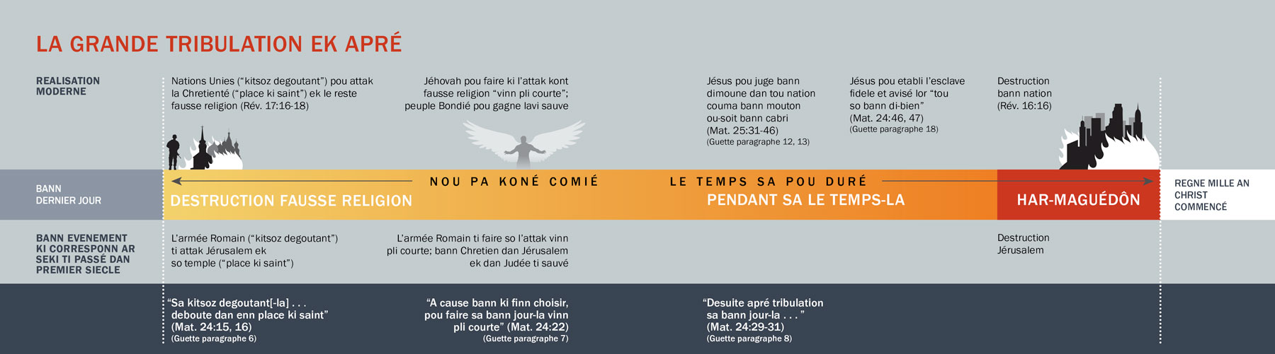6 Couma nou pou koné ki la grande tribulation inn commencé? Jésus ti annoncé: “Kan zot trouve sa kitsoz degoutant ki faire bann degat-la, lor ki prophete Daniel ti kozé, deboute dan enn place ki saint, (sa dimoune ki pé lire-la bizin servi so discernement,) alors bann ki dan Judée bizin commence sauvé ek al vers bann montagne.” (Mat. 24:15, 16) Dan premier realisation sa prophetie-la, l’expression “deboute dan enn place ki saint” ti arrivé en l’an 66 Nou Lepok, kan l’armée Romain (“sa kitsoz degoutant[-la]”) ti attak Jérusalem ek so temple (enn place ki saint pou bann Juif). Dan deuxieme ek pli grand realisation, sa pou arrivé kan Nations Unies (“kitsoz degoutant” dan nou lepok) pou attak la Chretienté (ki saint pou bann ki pretann zot Chretien) ek pou attak le reste Babylone la Grande. Révélation 17:16-18 koz lor sa mem l’attak-la. C’est avek sa l’evenement-la ki la grande tribulation pou commencé.