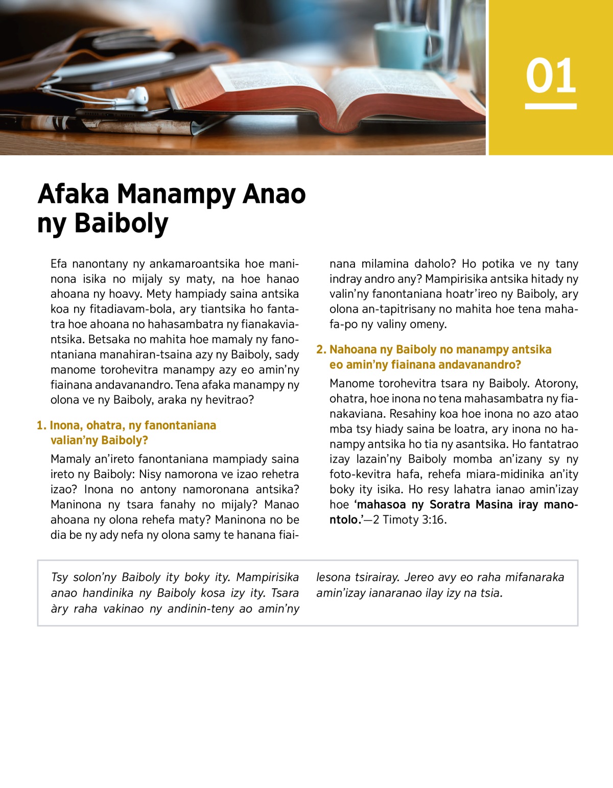 Tsy solon’ny Baiboly ity boky ity. Mampirisika anao handinika ny Baiboly kosa izy ity. Tsara àry raha vakinao ny andinin-teny ao amin’ny lesona tsirairay. Jereo avy eo raha mifanaraka amin’izay ianaranao ilay izy na tsia.