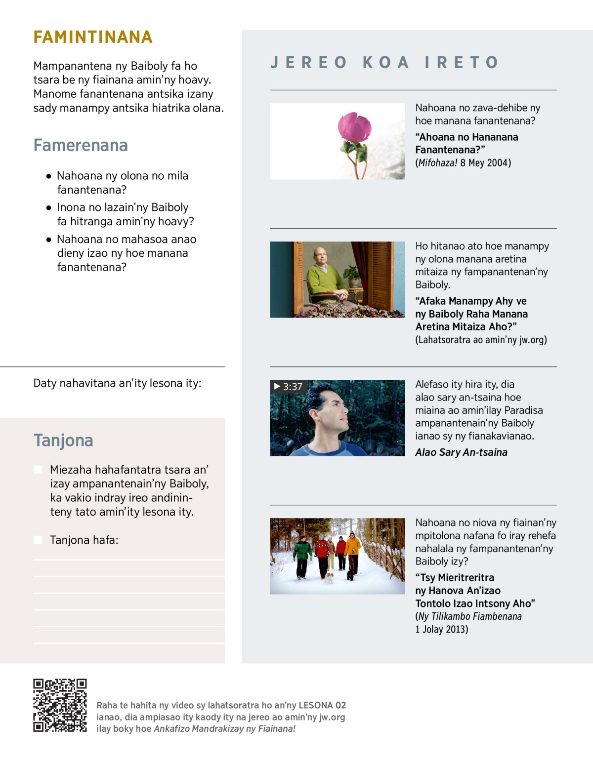 Alefaso ity hira ity, dia alao sary an-tsaina hoe miaina ao amin’ilay Paradisa ampanantenain’ny Baiboly ianao sy ny fianakavianao.