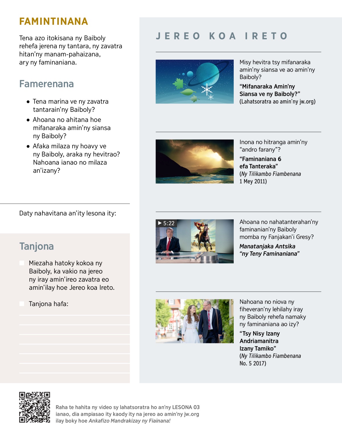 Misy faminanianaa be dia be ao amin’ny Baiboly, ary milaza mialoha “ny zavatra mbola tsy natao” izy ireny. (Isaia 46:10) Betsaka ny zava-nitranga miavaka efa nolazainy mialoha be. Noresahiny tamin’ny an-tsipiriany koa ny zavatra iainantsika amin’izao. Handinika faminaniana sasany ao amin’ny Baiboly isika ato amin’ity lesona ity. Mahavariana fa tanteraka tamin’ny an-tsipiriany izy ireny!