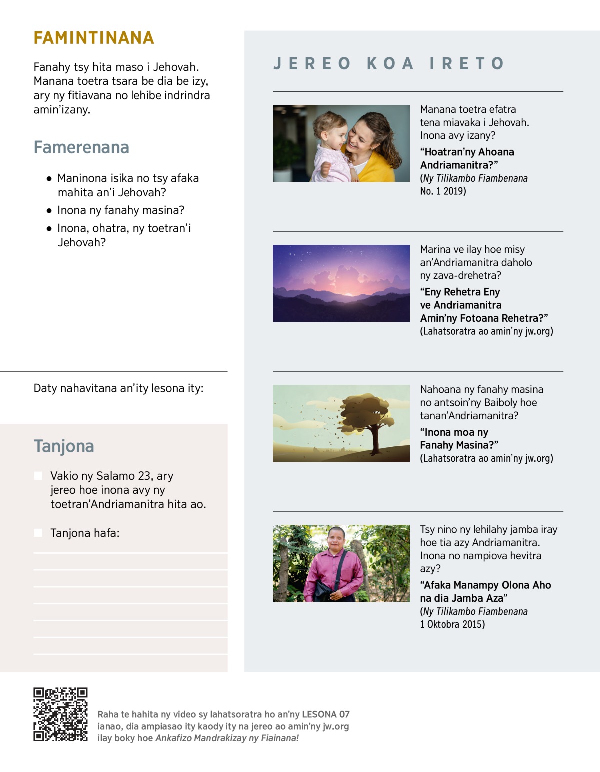 Hitantsika amin’ny zavatra noforonin’i Jehovah ny toetrany. Alefaso ilay VIDEO. Vakio ny Romanina 1:20 avy eo, ary iaraho midinika ny fanontaniana.