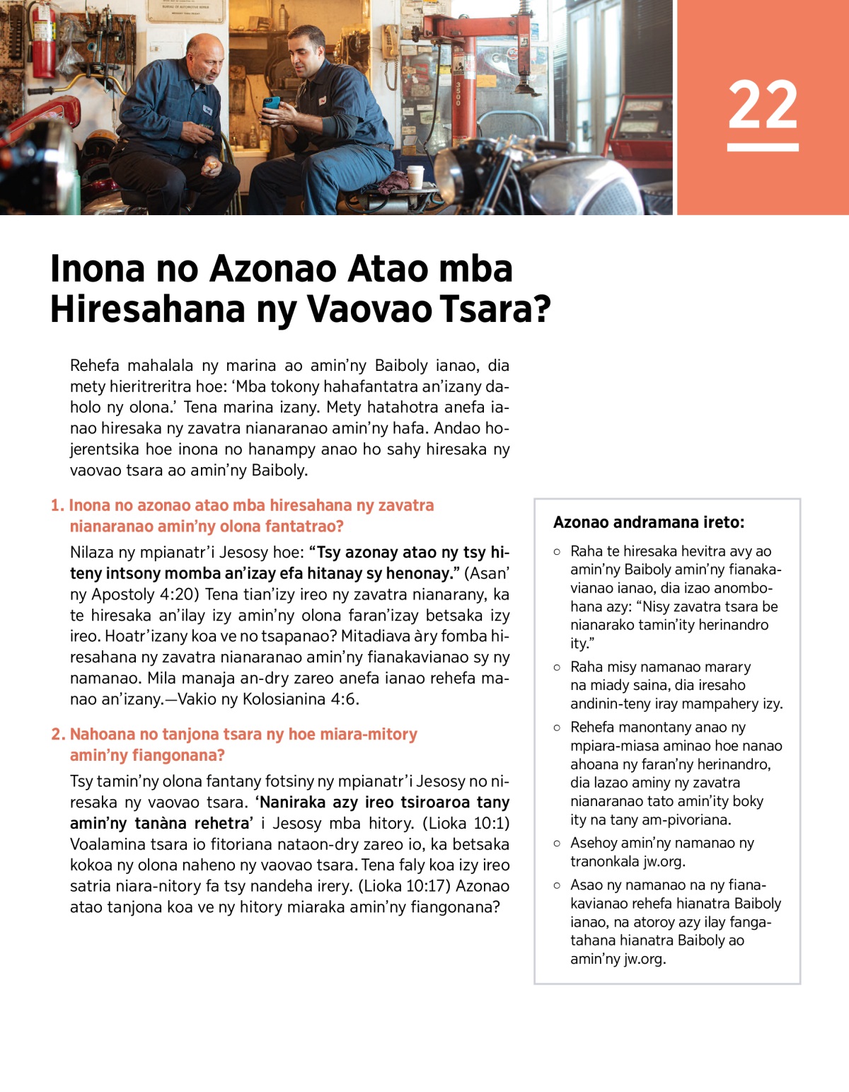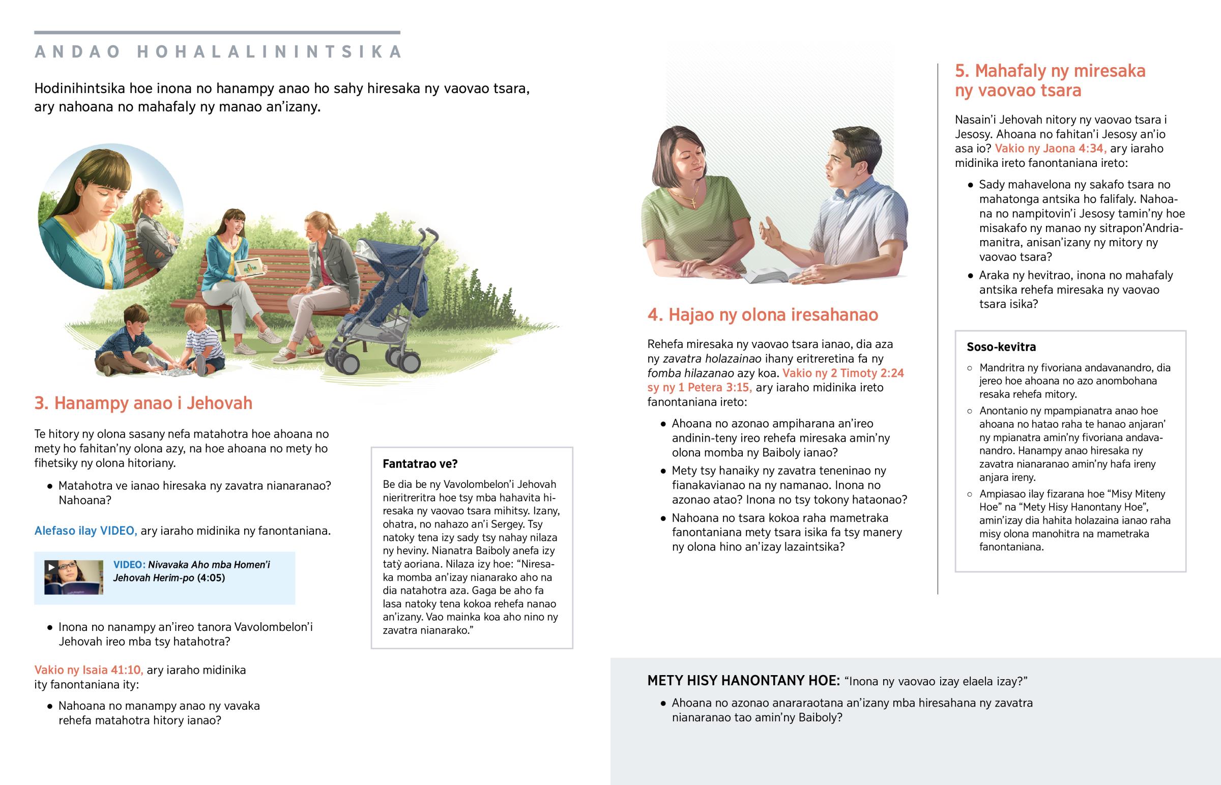 Rehefa miresaka ny vaovao tsara ianao, dia aza ny zavatra holazainao ihany eritreretina fa ny fomba hilazanao azy koa. Vakio ny 2 Timoty 2:24 sy ny 1 Petera 3:15, ary iaraho midinika ireto fanontaniana ireto: