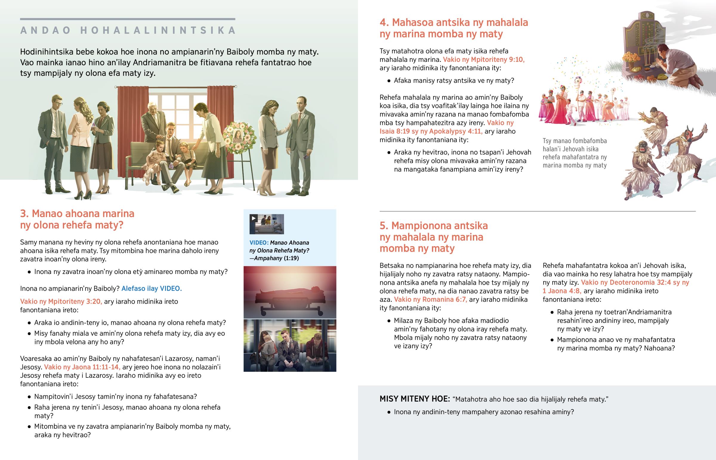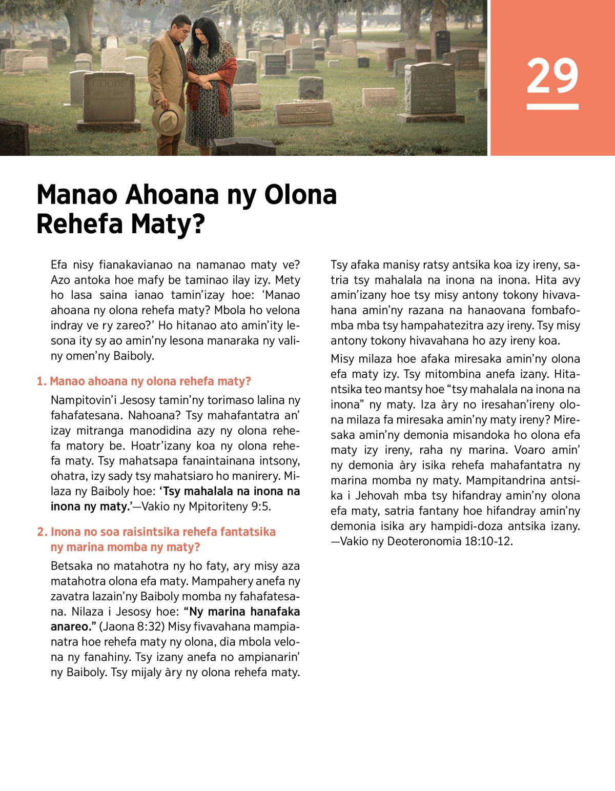 Efa nisy fianakavianao na namanao maty ve? Azo antoka hoe mafy be taminao ilay izy. Mety ho lasa saina ianao tamin’izay hoe: ‘Manao ahoana ny olona rehefa maty? Mbola ho velona indray ve ry zareo?’ Ho hitanao ato amin’ity lesona ity sy ao amin’ny lesona manaraka ny valiny omen’ny Baiboly.