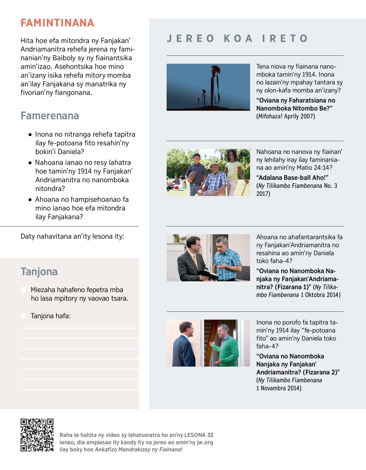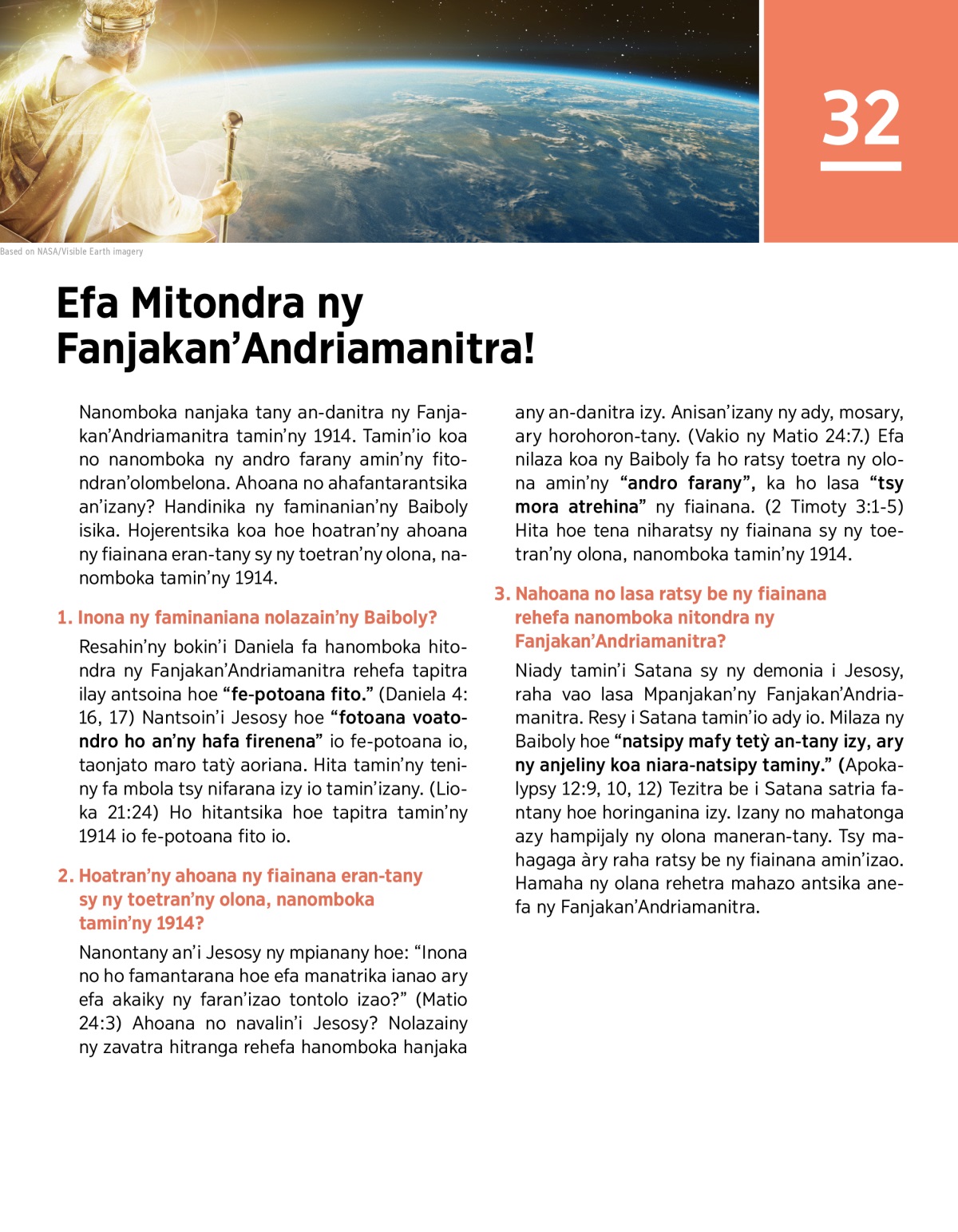 Nanomboka nanjaka tany an-danitra ny Fanjakan’Andriamanitra tamin’ny 1914. Tamin’io koa no nanomboka ny andro farany amin’ny fitondran’olombelona. Ahoana no ahafantarantsika an’izany? Handinika ny faminanian’ny Baiboly isika. Hojerentsika koa hoe hoatran’ny ahoana ny fiainana eran-tany sy ny toetran’ny olona, nanomboka tamin’ny 1914.