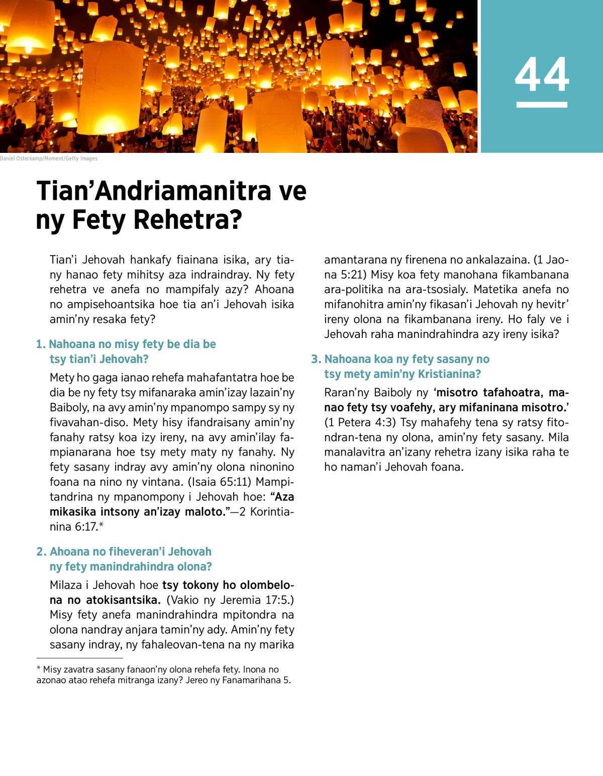 “Nahoana no Misy Fety Tsy Ataon’ny Vavolombelon’i Jehovah?” (Lahatsoratra ao amin’ny jw.org)