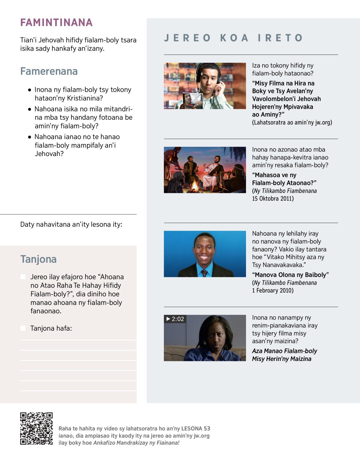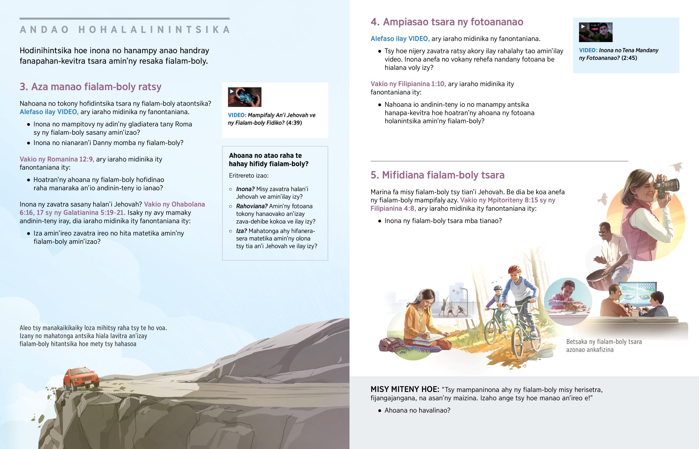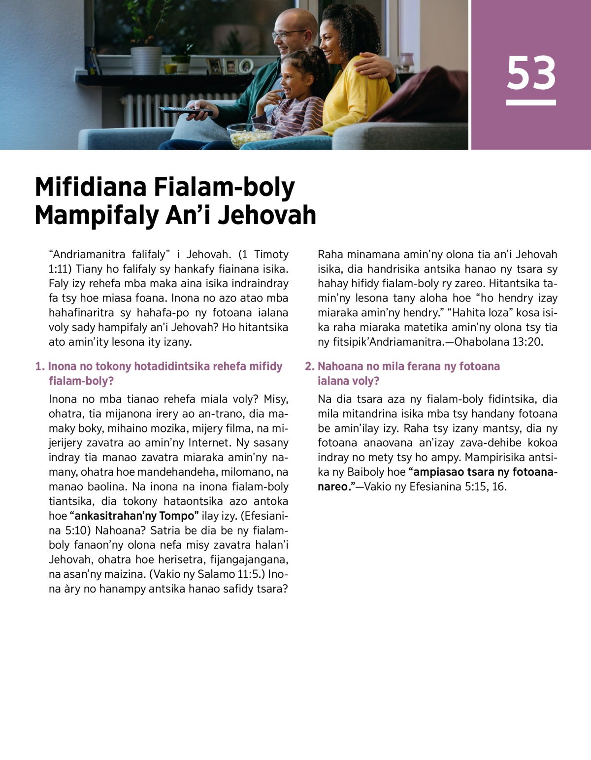 Inona no mba tianao rehefa miala voly? Misy, ohatra, tia mijanona irery ao an-trano, dia mamaky boky, mihaino mozika, mijery filma, na mijerijery zavatra ao amin’ny Internet. Ny sasany indray tia manao zavatra miaraka amin’ny namany, ohatra hoe mandehandeha, milomano, na manao baolina. Na inona na inona fialam-boly tiantsika, dia tokony hataontsika azo antoka hoe “ankasitrahan’ny Tompo” ilay izy. (Efesianina 5:10) Nahoana? Satria be dia be ny fialam-boly fanaon’ny olona nefa misy zavatra halan’i Jehovah, ohatra hoe herisetra, fijangajangana, na asan’ny maizina. (Vakio ny Salamo 11:5.) Inona àry no hanampy antsika hanao safidy tsara?