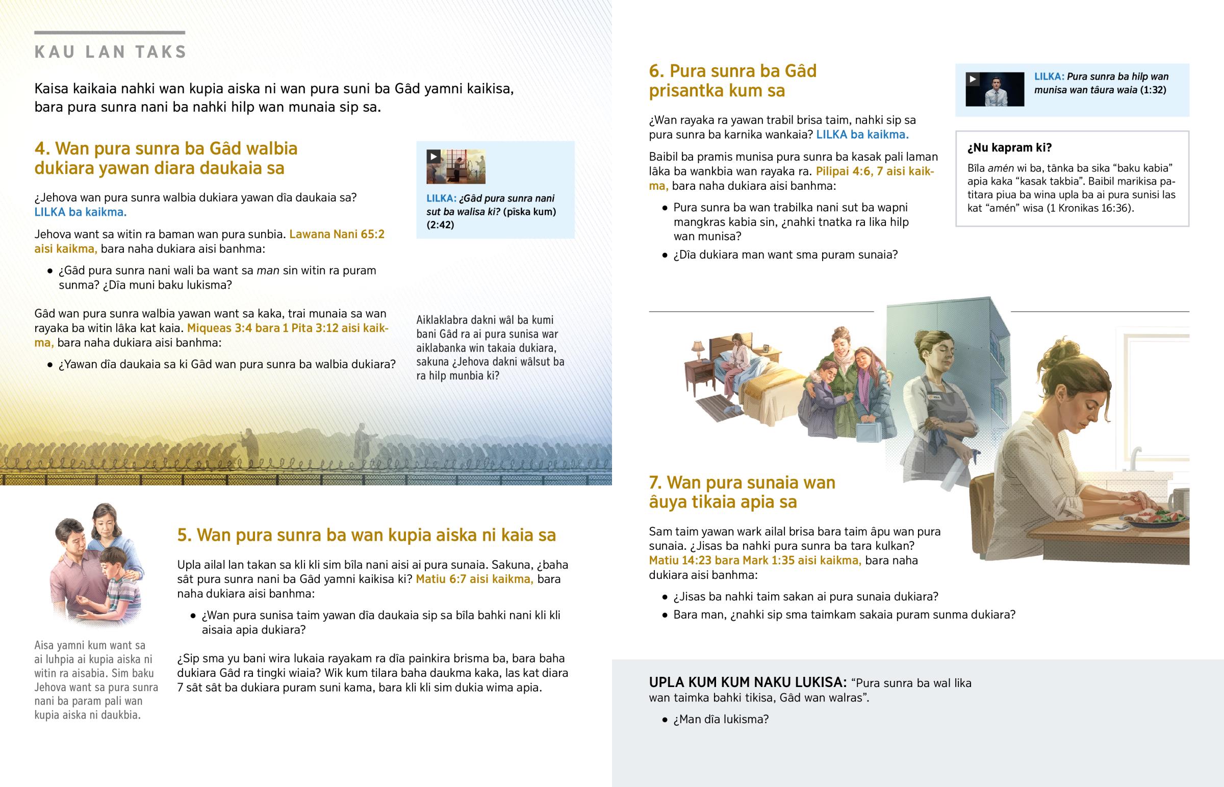 ¿Rayakam ra diara yamni upla mai smalkbia nit sma ki? ¿Diara kum kum tânkam briaia want sma? ¿Maisa nihkan lâka bara kupia bukaia lâka briaia nit sma ki? ¿Jehova wal kau asla kaia want sma ki? Baha sut nit sma ba briaia sip sma puram sunisma kaka. Sakuna, ¿nahki wan pura sunaia sa? ¿Upla sut ai pura suni ba ra Gâd mita walisa ki? ¿Man dîa daukaia sma puram sunisma ba ra Gâd mai walbia dukiara? Kaisa kaikaia.
