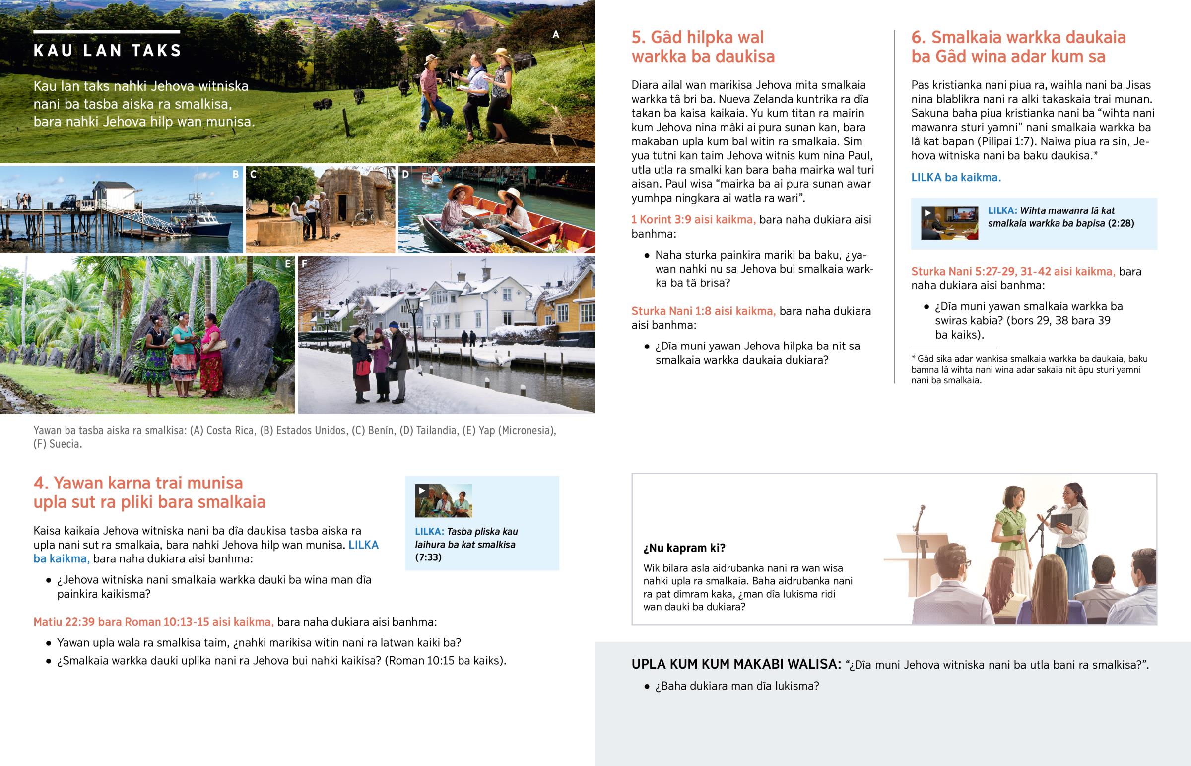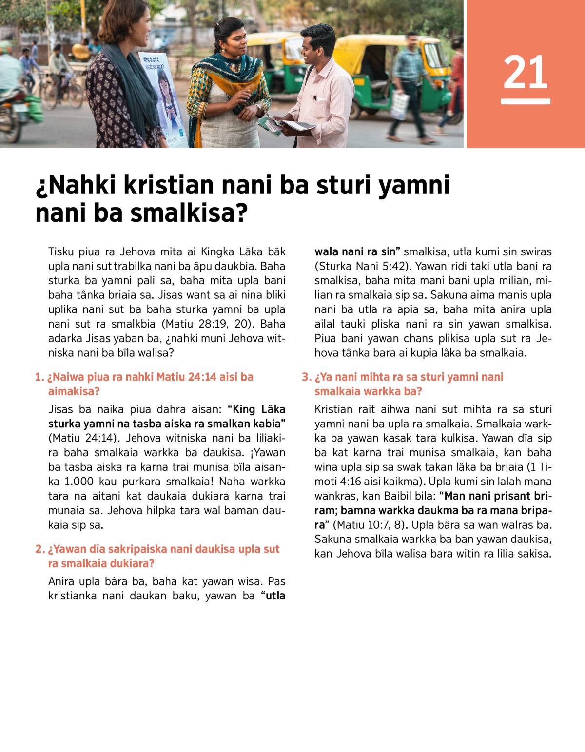 Tisku piua ra Jehova mita ai Kingka Lâka bâk upla nani sut trabilka nani ba âpu daukbia. Baha sturka ba yamni pali sa, baha mita upla bani baha tânka briaia sa. Jisas want sa ai nina bliki uplika nani sut ba baha sturka yamni ba upla nani sut ra smalkbia (Matiu 28:19, 20). Baha adarka Jisas yaban ba, ¿nahki muni Jehova witniska nani ba bîla walisa?