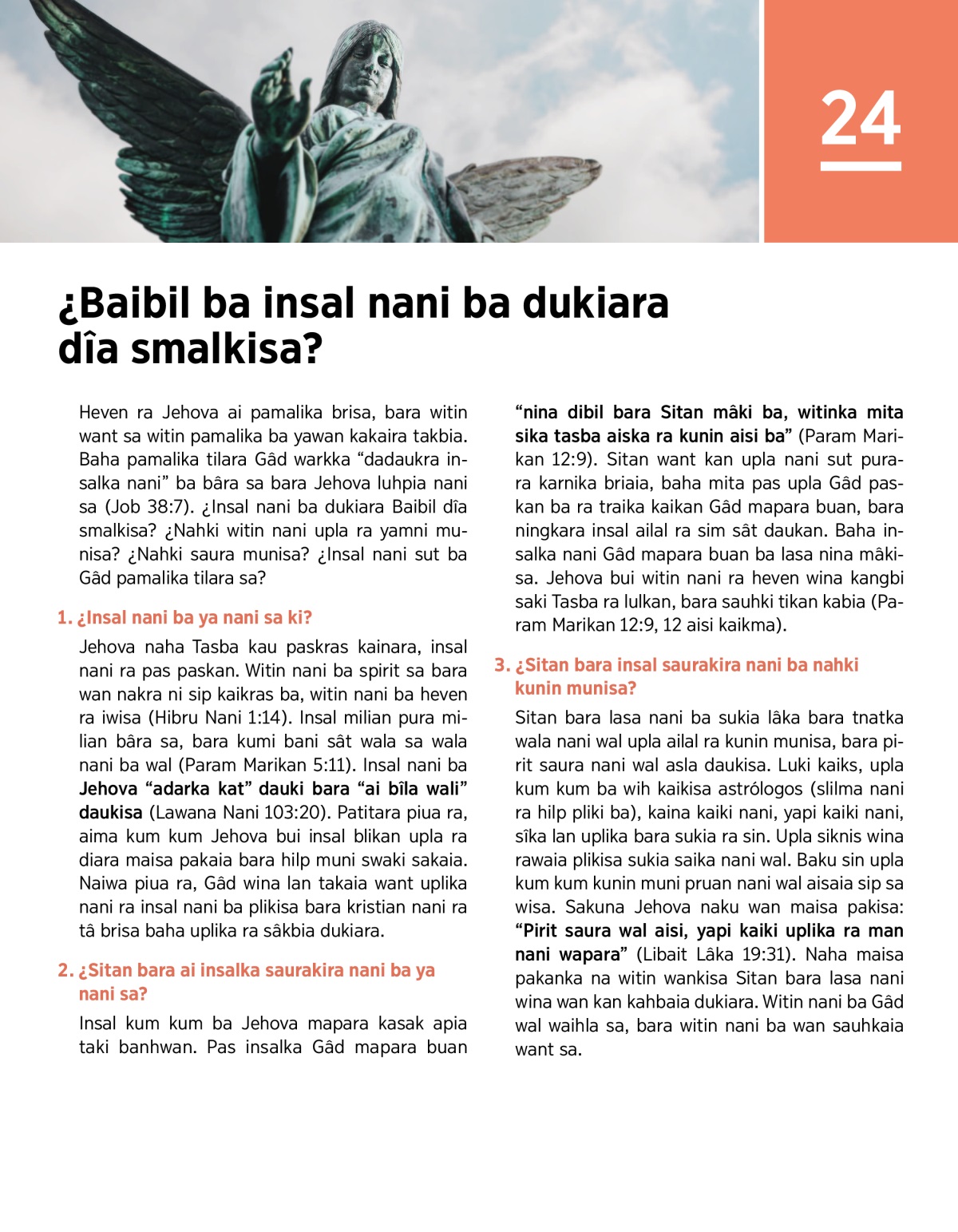 Jehova naha Tasba kau paskras kainara, insal nani ra pas paskan. Witin nani ba spirit sa bara wan nakra ni sip kaikras ba, witin nani ba heven ra iwisa (Hibru Nani 1:14). Insal milian pura milian bâra sa, bara kumi bani sât wala sa wala nani ba wal (Param Marikan 5:11). Insal nani ba Jehova “adarka kat” dauki bara “ai bîla wali” daukisa (Lawana Nani 103:20). Patitara piua ra, aima kum kum Jehova bui insal blikan upla ra diara maisa pakaia bara hilp muni swaki sakaia. Naiwa piua ra, Gâd wina lan takaia want uplika nani ra insal nani ba plikisa bara kristian nani ra tâ brisa baha uplika ra sâkbia dukiara.