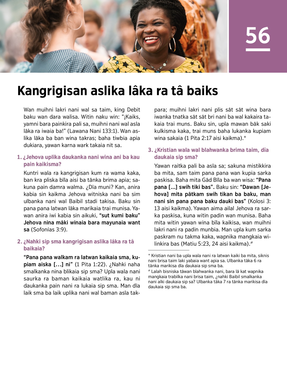 “Pana pana walkam ra latwan kaikaia sma, kupiam aiska […] ni” (1 Pita 1:22). ¿Nahki naha smalkanka nina blikaia sip sma? Upla wala nani saurka ra baman kaikaia watlika ra, kau ni daukanka pain nani ra lukaia sip sma. Man dîa laik sma ba laik uplika nani wal baman asla takpara; muihni lakri nani plis sât sât wina bara iwanka tnatka sât sât bri nani ba wal kakaira takaia trai muns. Baku sin, upla mawan bâk saki kulkisma kaka, trai muns baha lukanka kupiam wina sakaia (1 Pita 2:17 aisi kaikma).a