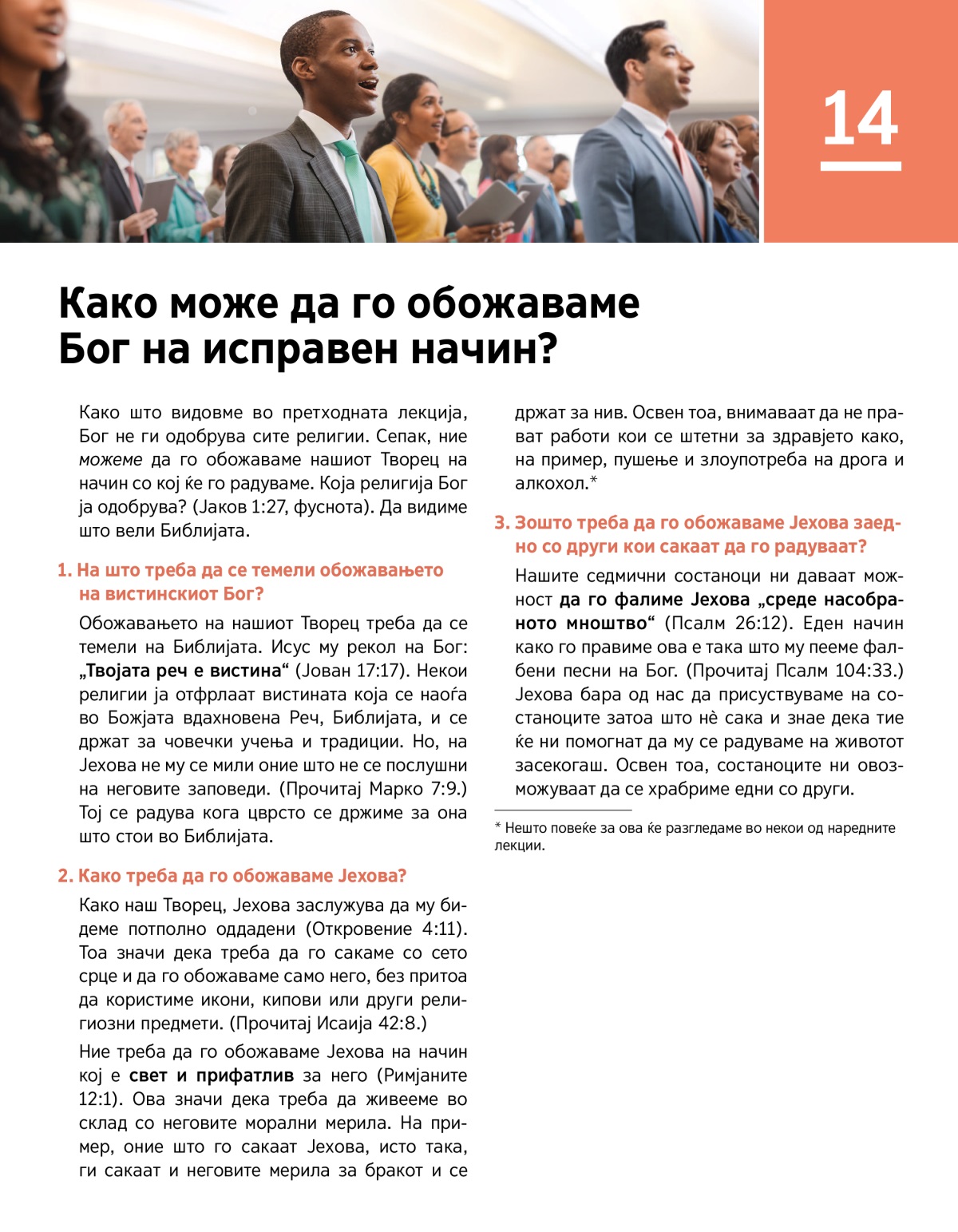 Како што видовме во претходната лекција, Бог не ги одобрува сите религии. Сепак, ние можеме да го обожаваме нашиот Творец на начин со кој ќе го радуваме. Која религија Бог ја одобрува? (Јаков 1:27, фуснота). Да видиме што вели Библијата.