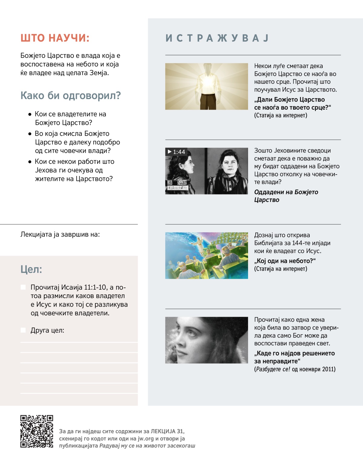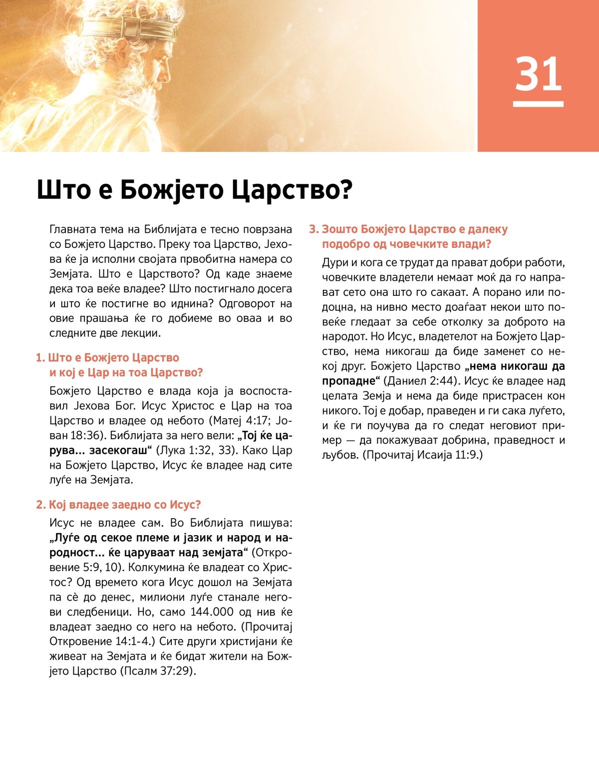 Главната тема на Библијата е тесно поврзана со Божјето Царство. Преку тоа Царство, Јехова ќе ја исполни својата првобитна намера со Земјата. Што е Царството? Од каде знаеме дека тоа веќе владее? Што постигнало досега и што ќе постигне во иднина? Одговорот на овие прашања ќе го добиеме во оваа и во следните две лекции.