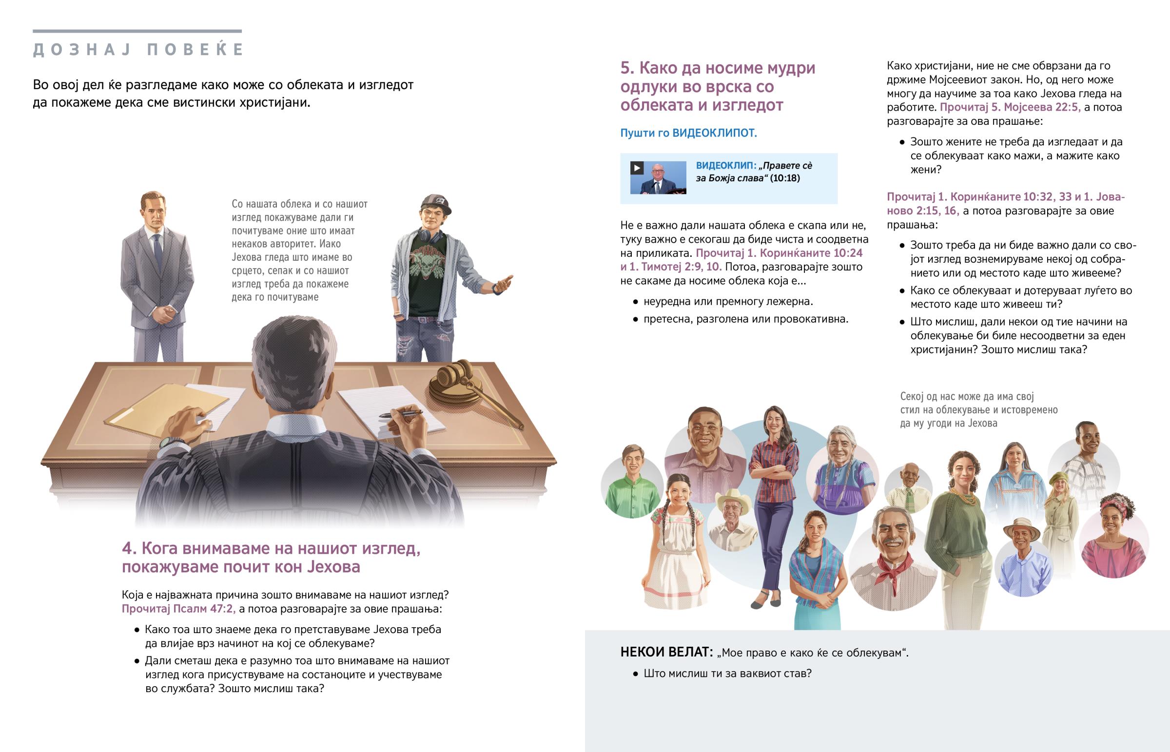 Не е важно дали нашата облека е скапа или не, туку важно е секогаш да биде чиста и соодветна на приликата. Прочитај 1. Коринќаните 10:24 и 1. Тимотеј 2:9, 10. Потоа, разговарајте зошто не сакаме да носиме облека која е...