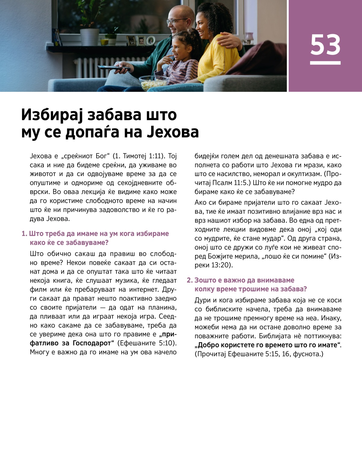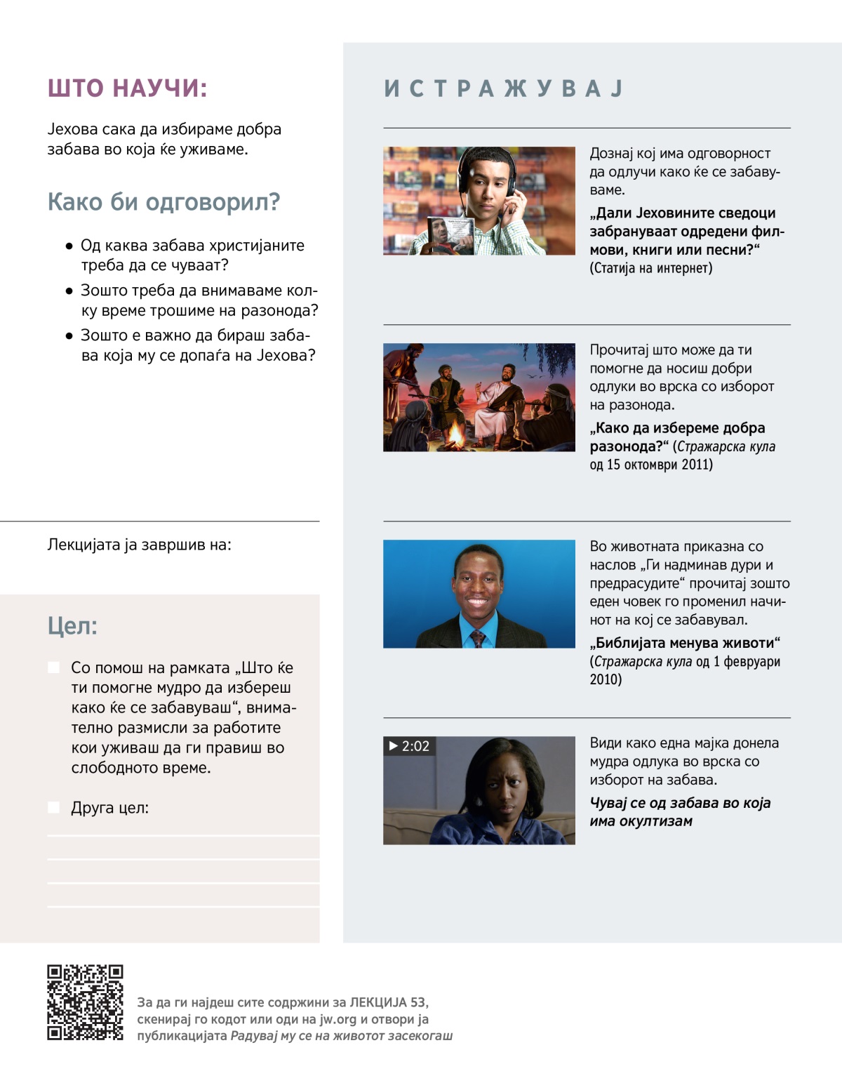 Јехова е „среќниот Бог“ (1. Тимотеј 1:11). Тој сака и ние да бидеме среќни, да уживаме во животот и да си одвојуваме време за да се опуштиме и одмориме од секојдневните обврски. Во оваа лекција ќе видиме како може да го користиме слободното време на начин што ќе ни причинува задоволство и ќе го радува Јехова.