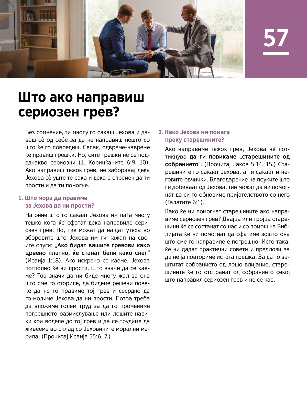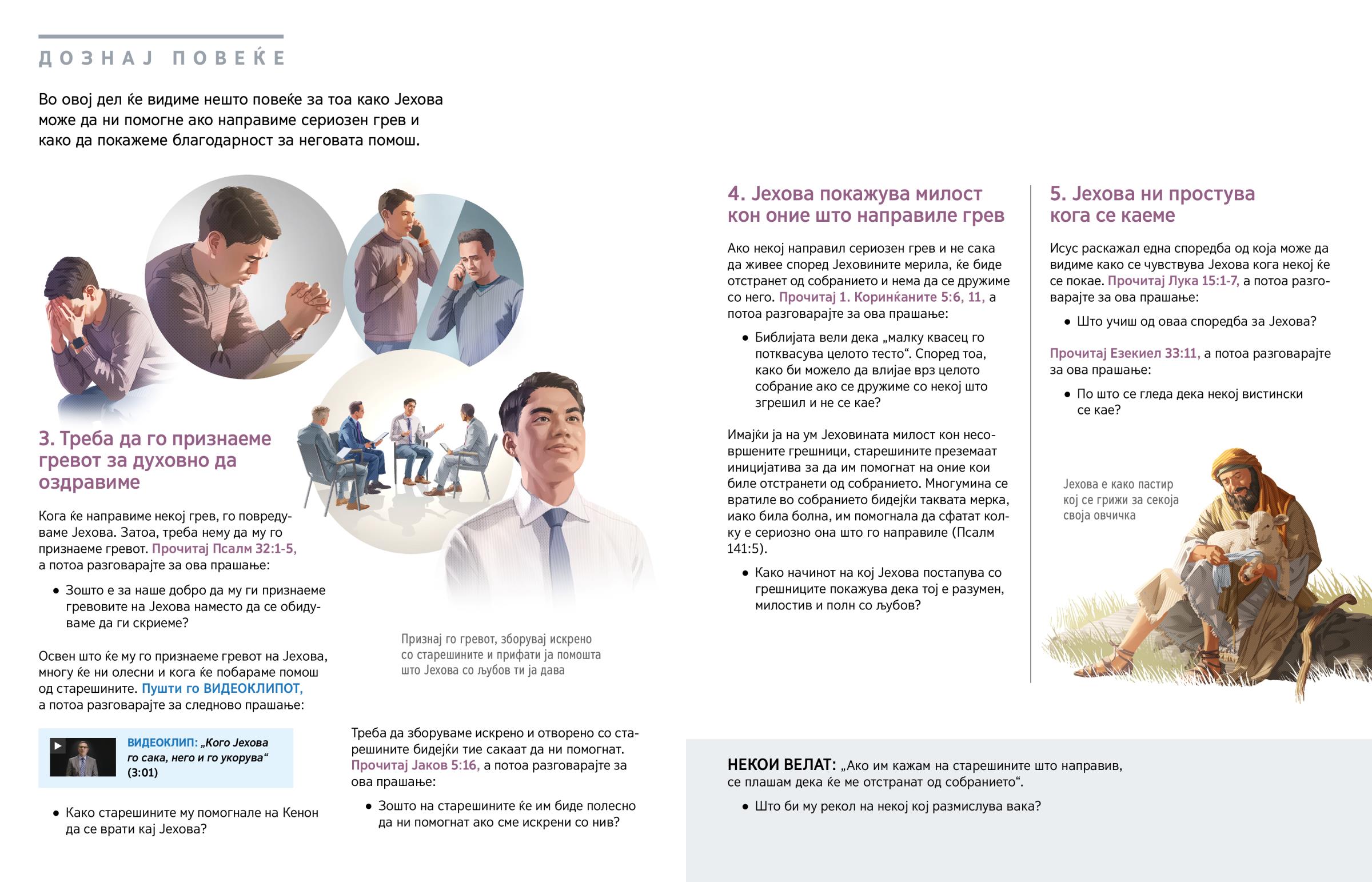 Како ќе ни помогнат старешините ако направиме сериозен грев? Двајца или тројца старешини ќе се состанат со нас и со помош на Библијата ќе ни помогнат да сфатиме зошто она што сме го направиле е погрешно. Исто така, ќе ни дадат практични совети и предлози за да не ја повториме истата грешка. За да го заштитат собранието од лошо влијание, старешините ќе го отстранат од собранието секој што направил сериозен грев и не се кае.