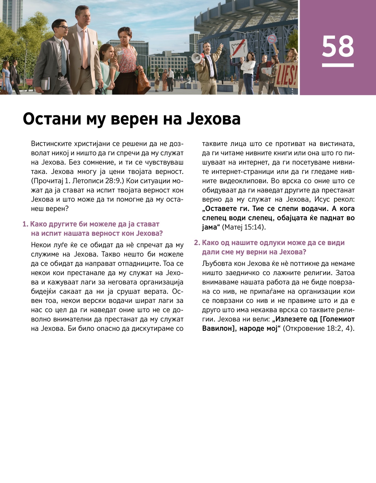 Вистинските христијани се решени да не дозволат никој и ништо да ги спречи да му служат на Јехова. Без сомнение, и ти се чувствуваш така. Јехова многу ја цени твојата верност. (Прочитај 1. Летописи 28:9.) Кои ситуации можат да ја стават на испит твојата верност кон Јехова и што може да ти помогне да му останеш верен?