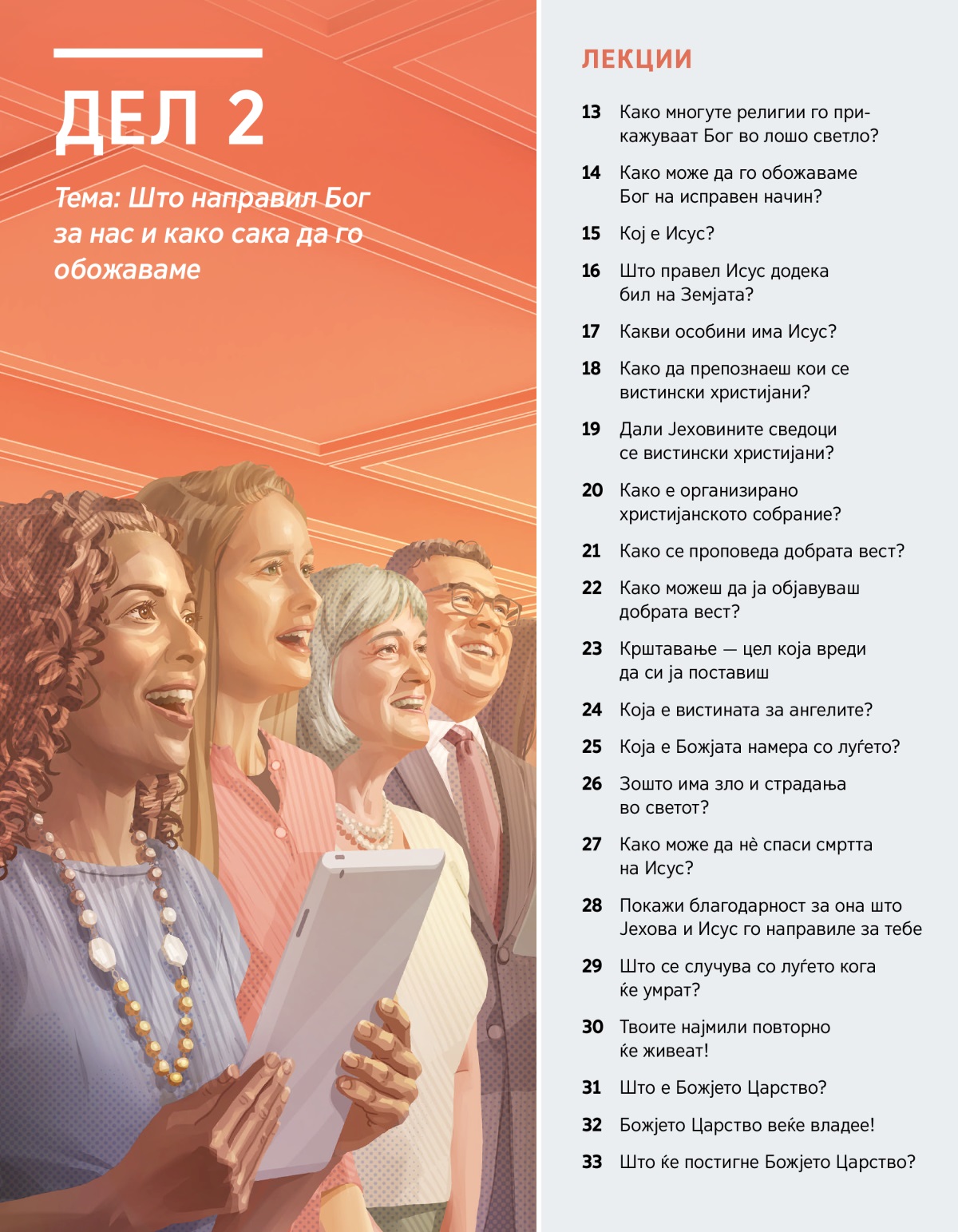 Дел 2 Печатено издание Тема: Што направил Бог за нас и како сака да го обожаваме ЛЕКЦИИ 13 Како многуте религии го прикажуваат Бог во лошо светло? 14 Како може да го обожаваме Бог на исправен начин? 15 Кој е Исус? 16 Што правел Исус додека бил на Земјата? 17 Какви особини има Исус? 18 Како да препознаеш кои се вистински христијани? 19 Дали Јеховините сведоци се вистински христијани? 20 Како е организирано христијанското собрание? 21 Како се проповеда добрата вест? 22 Како можеш да ја објавуваш добрата вест? 23 Крштавање — цел која вреди да си ја поставиш 24 Која е вистината за ангелите? 25 Која е Божјата намера со луѓето? 26 Зошто има зло и страдања во светот? 27 Како може да нѐ спаси смртта на Исус? 28 Покажи благодарност за она што Јехова и Исус го направиле за тебе 29 Што се случува со луѓето кога ќе умрат? 30 Твоите најмили повторно ќе живеат! 31 Што е Божјето Царство? 32 Божјето Царство веќе владее! 33 Што ќе постигне Божјето Царство?