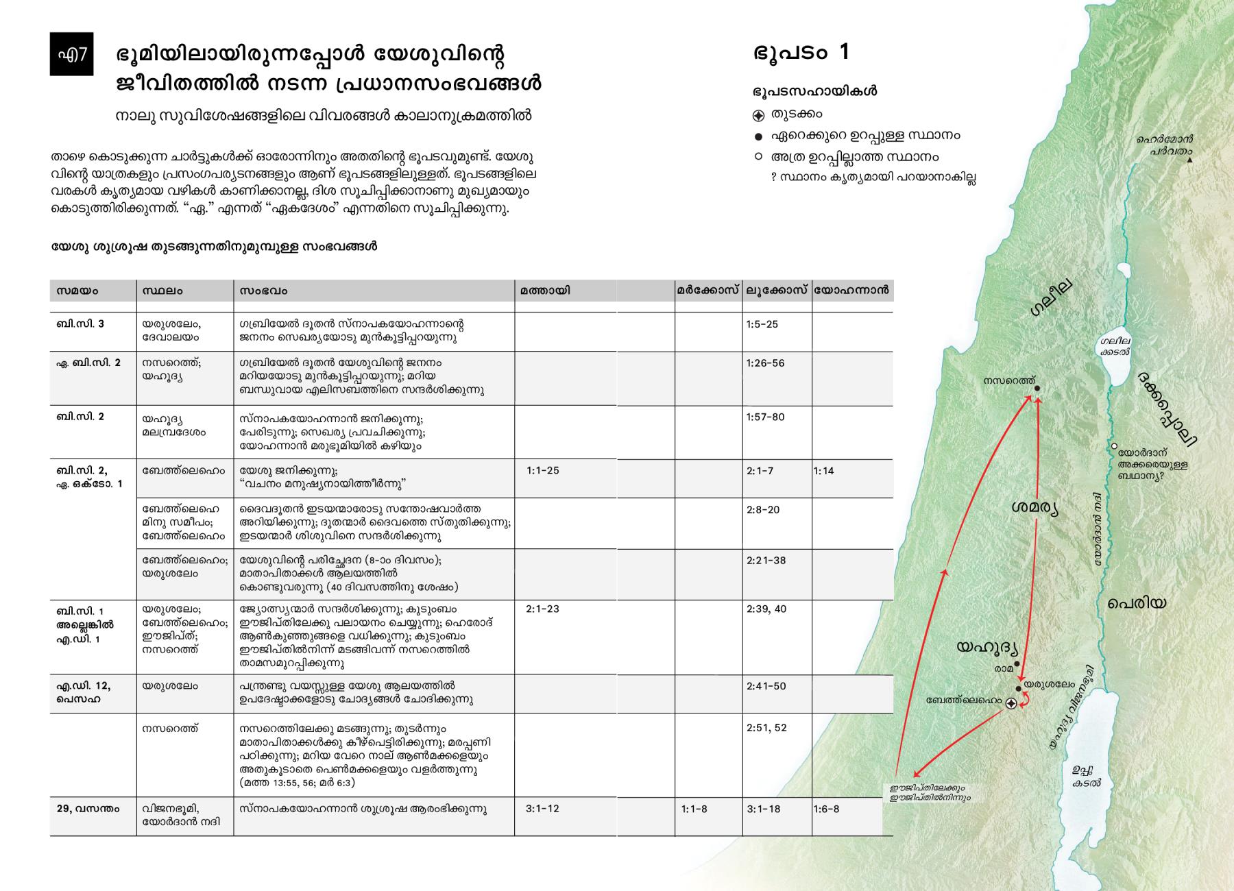 താഴെ കൊടുക്കുന്ന ചാർട്ടുകൾക്ക് ഓരോന്നിനും അതതിന്റെ ഭൂപടവുമുണ്ട്. യേശുവിന്റെ യാത്രകളും പ്രസംഗപര്യടനങ്ങളും ആണ് ഭൂപടങ്ങളിലുള്ളത്. ഭൂപടങ്ങളിലെ വരകൾ കൃത്യമായ വഴികൾ കാണിക്കാനല്ല, ദിശ സൂചിപ്പിക്കാനാണു മുഖ്യമായും കൊടുത്തിരിക്കുന്നത്. “ഏ.” എന്നത് “ഏകദേശം” എന്നതിനെ സൂചിപ്പിക്കുന്നു.