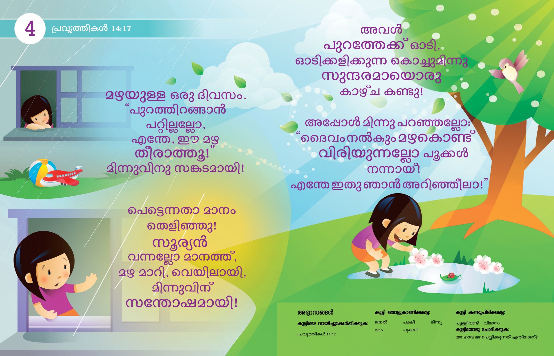 അപ്പോൾ മിന്നു പറഞ്ഞല്ലോ: “ദൈവം നൽകും മഴകൊണ്ട് വിരിയുന്നല്ലോ പൂക്കൾ നന്നായ്! എന്തേ ഇതു ഞാൻ അറിഞ്ഞീലാ!”