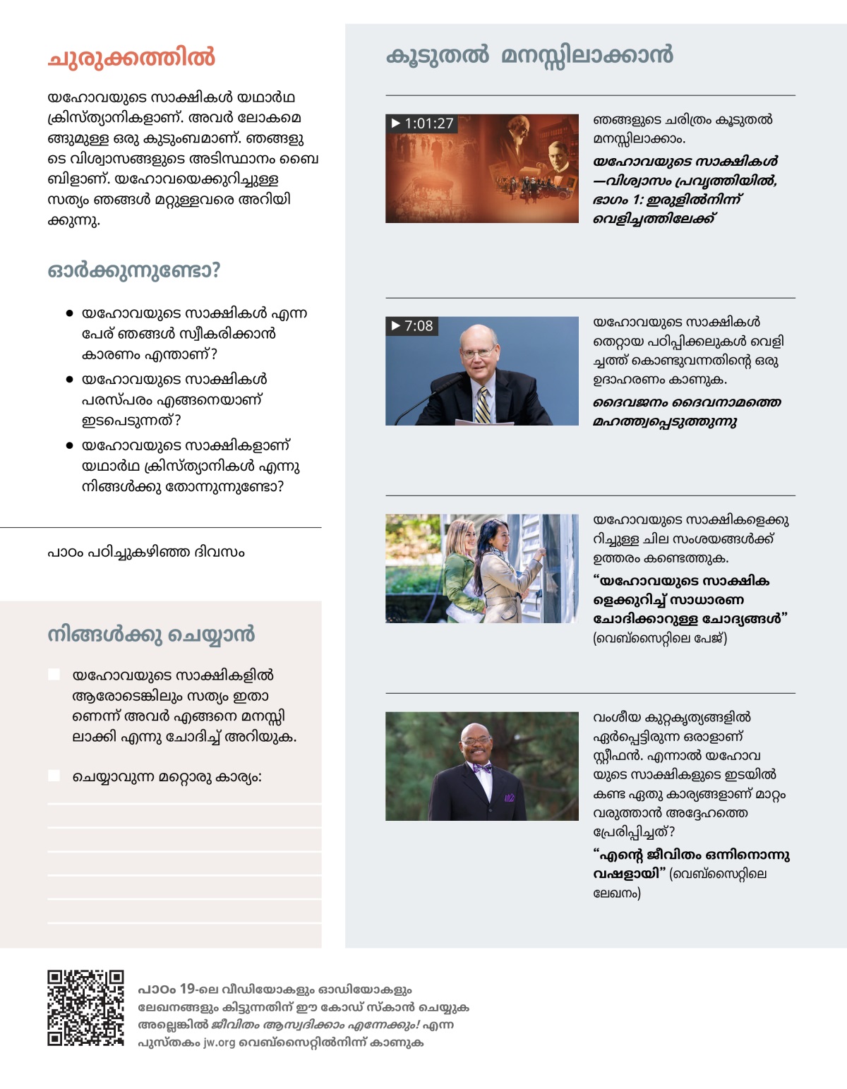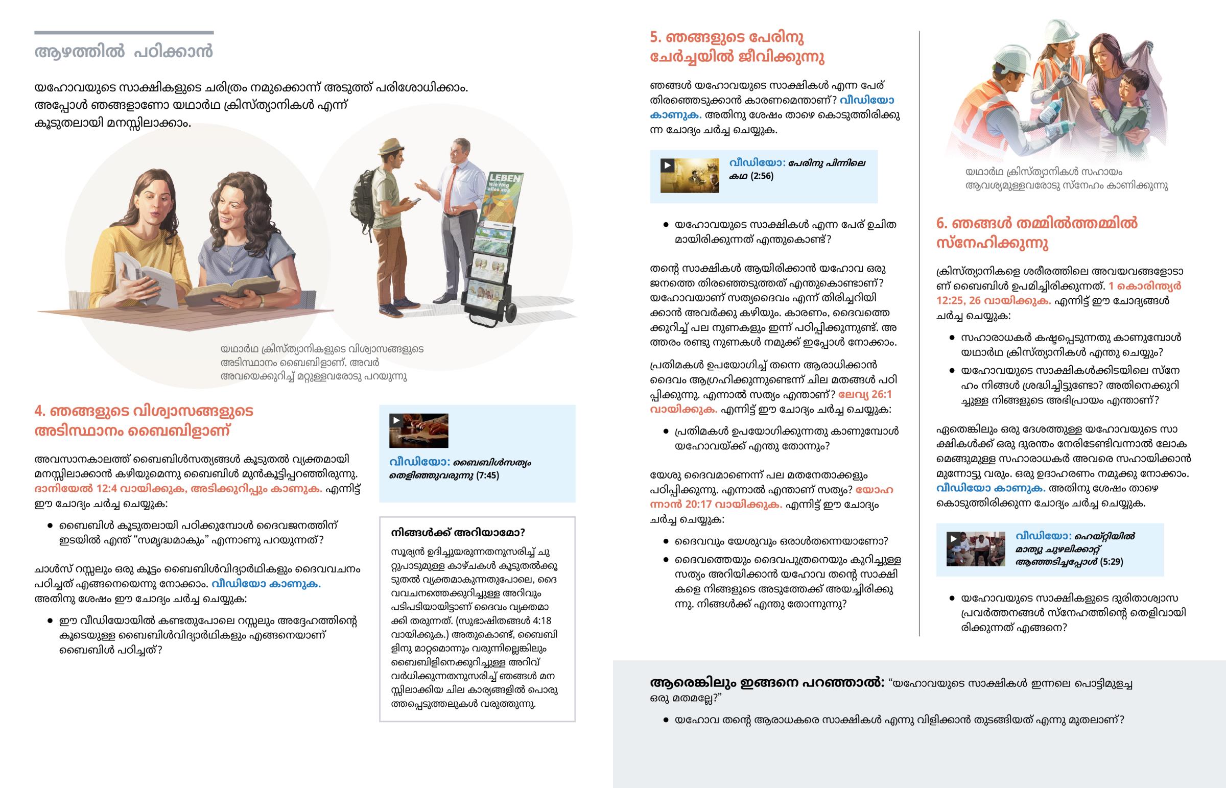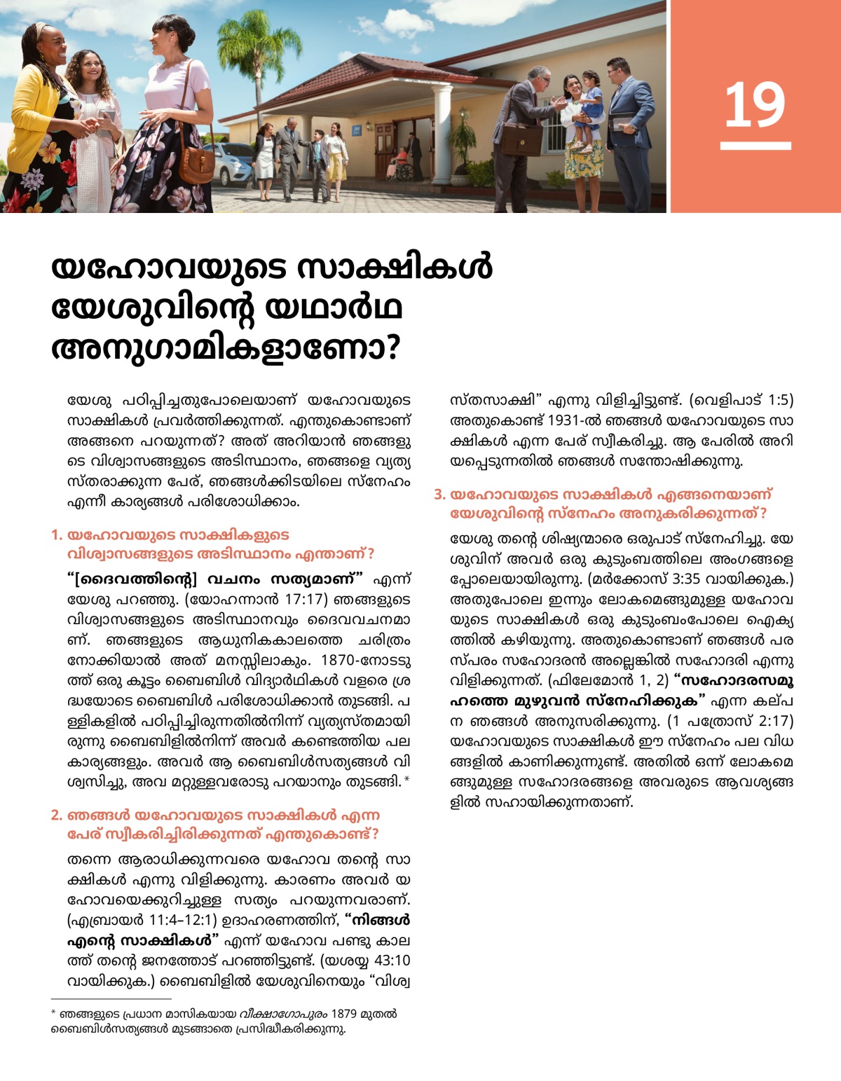 യഹോവയുടെ സാക്ഷികൾ യഥാർഥ ക്രിസ്ത്യാനികളാണ്. അവർ ലോകമെങ്ങുമുള്ള ഒരു കുടുംബമാണ്. ഞങ്ങളുടെ വിശ്വാസങ്ങളുടെ അടിസ്ഥാനം ബൈബിളാണ്. യഹോവയെക്കുറിച്ചുള്ള സത്യം ഞങ്ങൾ മറ്റുള്ളവരെ അറിയിക്കുന്നു.
