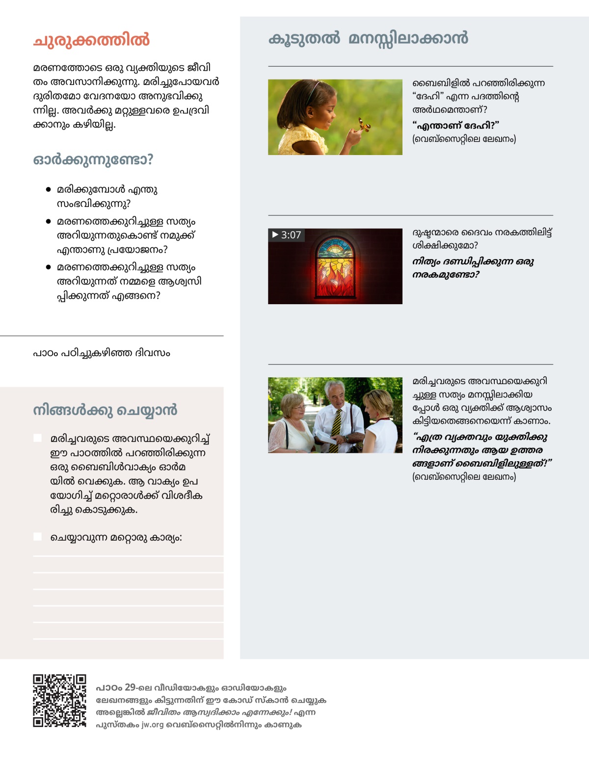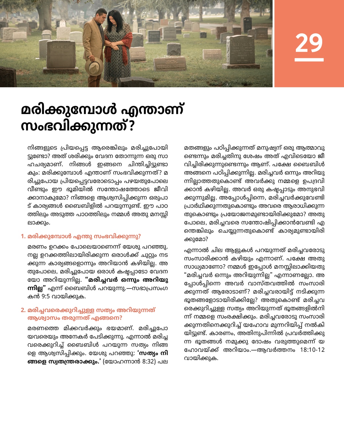 നിങ്ങളുടെ പ്രിയപ്പെട്ട ആരെങ്കിലും മരിച്ചുപോയിട്ടുണ്ടോ? അത് ശരിക്കും വേദന തോന്നുന്ന ഒരു സാഹചര്യമാണ്. നിങ്ങൾ ഇങ്ങനെ ചിന്തിച്ചിട്ടുണ്ടാകും: മരിക്കുമ്പോൾ എന്താണ് സംഭവിക്കുന്നത്? മരിച്ചുപോയ പ്രിയപ്പെട്ടവരോടൊപ്പം പഴയതുപോലെ വീണ്ടും ഈ ഭൂമിയിൽ സന്തോഷത്തോടെ ജീവിക്കാനാകുമോ? നിങ്ങളെ ആശ്വസിപ്പിക്കുന്ന ഒരുപാട് കാര്യങ്ങൾ ബൈബിളിൽ പറയുന്നുണ്ട്. ഈ പാഠത്തിലും അടുത്ത പാഠത്തിലും നമ്മൾ അതു മനസ്സിലാക്കും.