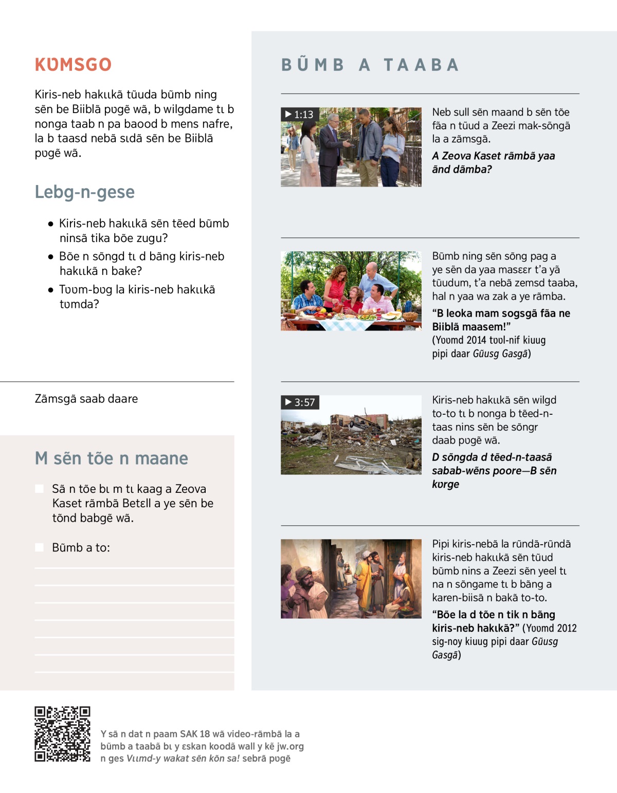 Neb kẽer sẽn yet tɩ b yaa kiris-neb pa tagsd tɩ tara yõod tɩ b bao n bãng sɩdã sẽn be Biiblã pʋgẽ wã ye. Ges-y VIDEO wã, tɩ rẽ poor bɩ y leok sokrã.
