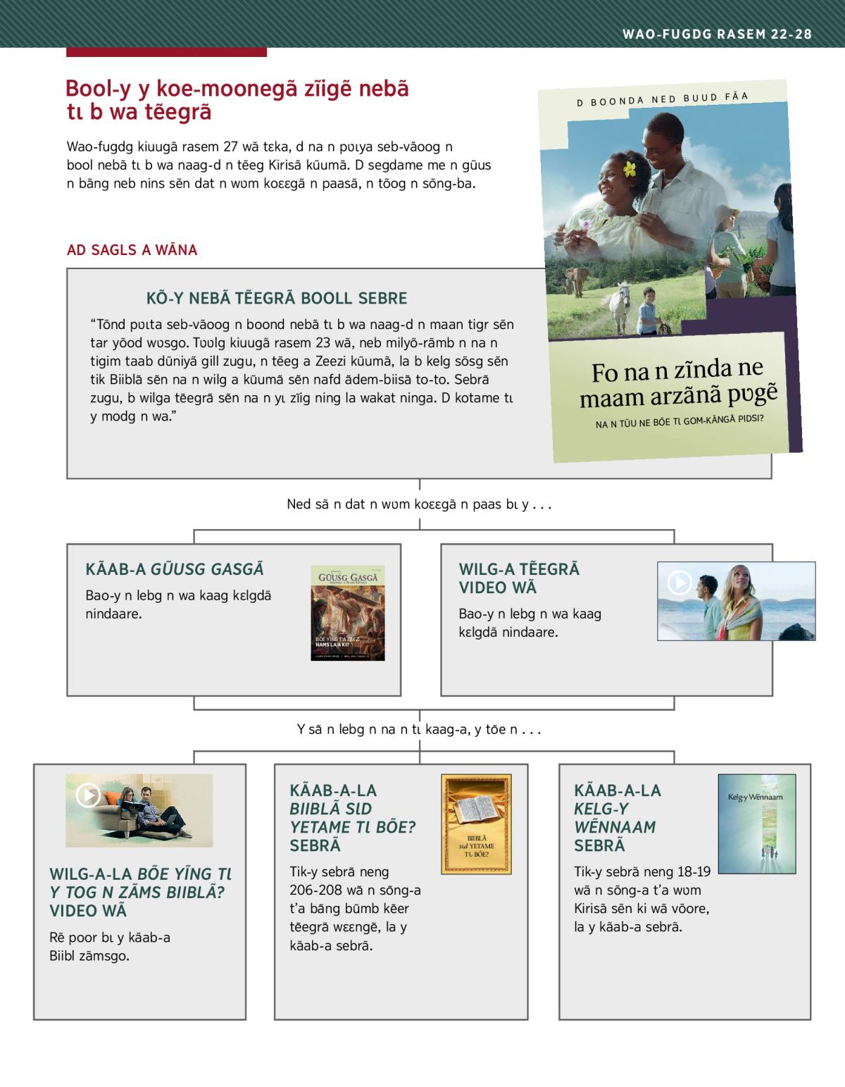 “Tõnd pʋɩta seb-vãoog n boond nebã tɩ b wa naag-d n maan tigr sẽn tar yõod wʋsgo. Tʋʋlg kiuugã rasem 23 wã, neb milyõ-rãmb n na n tigim taab dũniyã gill zugu, n tẽeg a Zeezi kũumã, la b kelg sõsg sẽn tik Biiblã sẽn na n wilg a kũumã sẽn nafd ãdem-biisã to-to. Sebrã zugu, b wilga tẽegrã sẽn na n yɩ zĩig ning la wakat ninga. D kotame tɩ y modg n wa.”