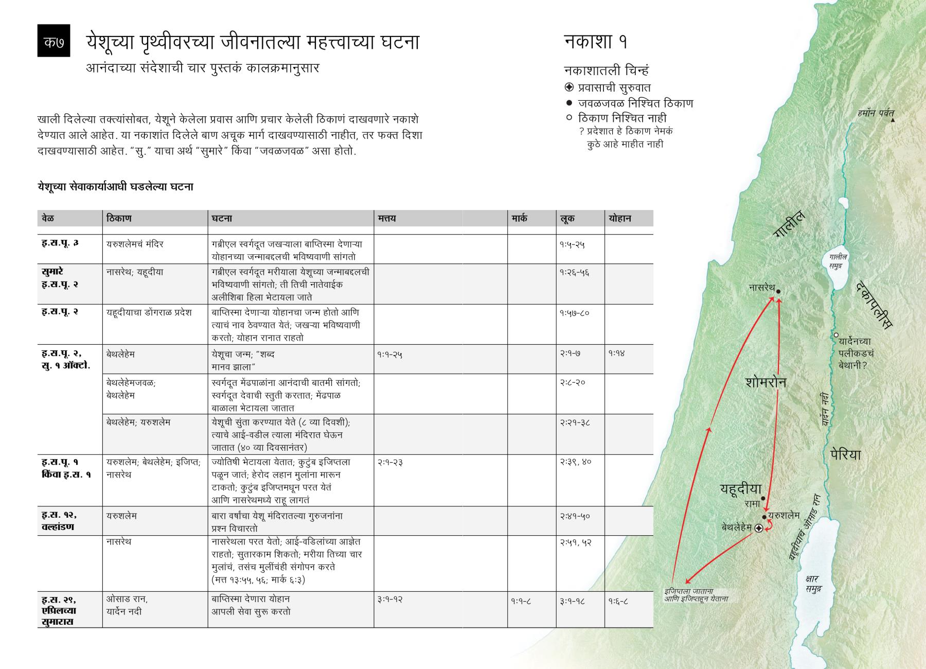खाली दिलेल्या तक्त्यांसोबत, येशूने केलेला प्रवास आणि प्रचार केलेली ठिकाणं दाखवणारे नकाशे देण्यात आले आहेत. या नकाशांत दिलेले बाण अचूक मार्ग दाखवण्यासाठी नाहीत, तर फक्त दिशा दाखवण्यासाठी आहेत. “सु.” याचा अर्थ “सुमारे” किंवा “जवळजवळ” असा होतो.