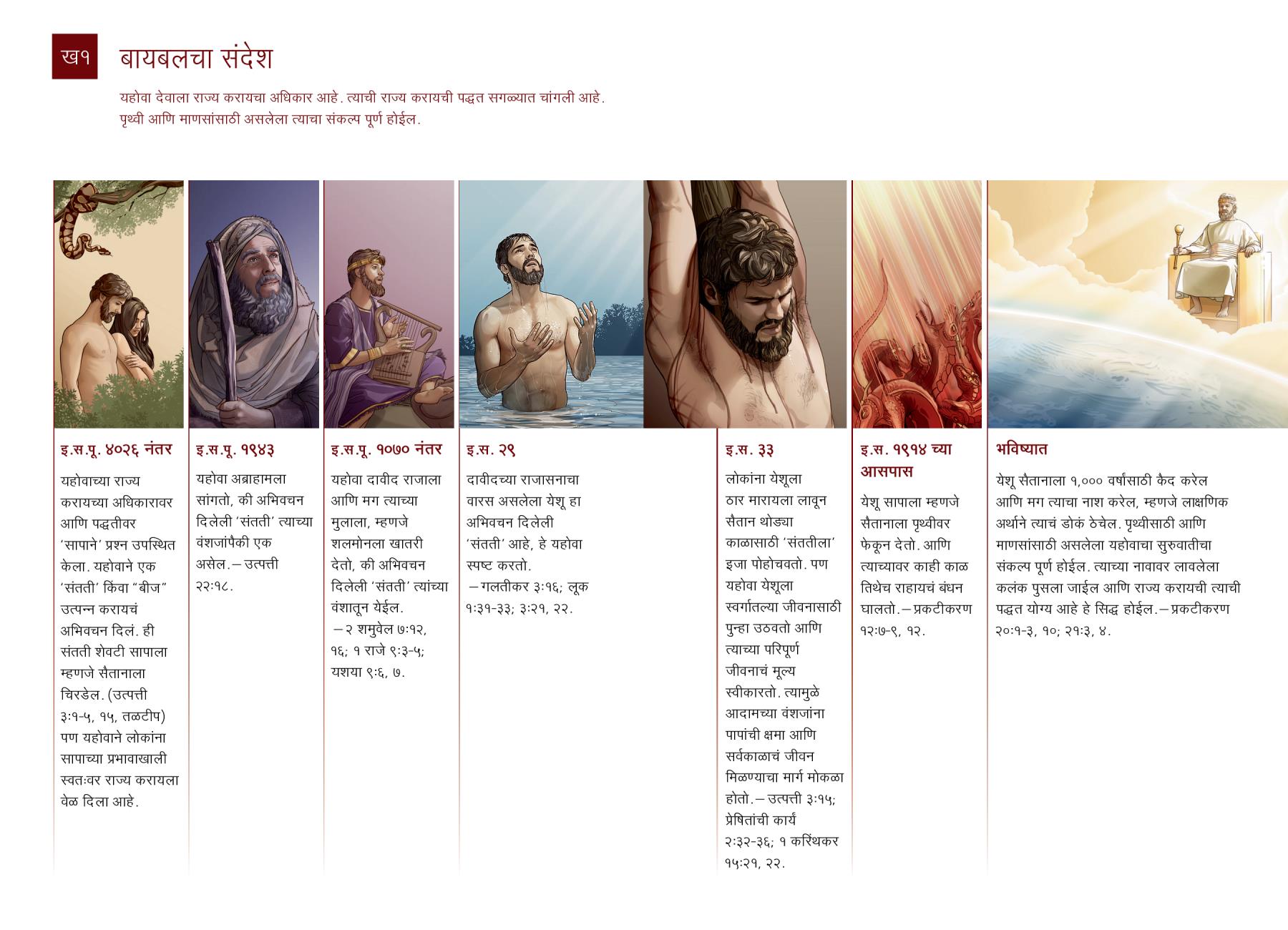 इ.स.पू. ४०२६ नंतर यहोवाच्या राज्य करायच्या अधिकारावर आणि पद्धतीवर ‘सापाने’ प्रश्न उपस्थित केला. यहोवाने एक ‘संतती’ किंवा “बीज” उत्पन्न करायचं अभिवचन दिलं. ही संतती शेवटी सापाला म्हणजे सैतानाला चिरडेल. (उत्पत्ती ३:१-५, १५, तळटीप) पण यहोवाने लोकांना सापाच्या प्रभावाखाली स्वतःवर राज्य करायला वेळ दिला आहे. |