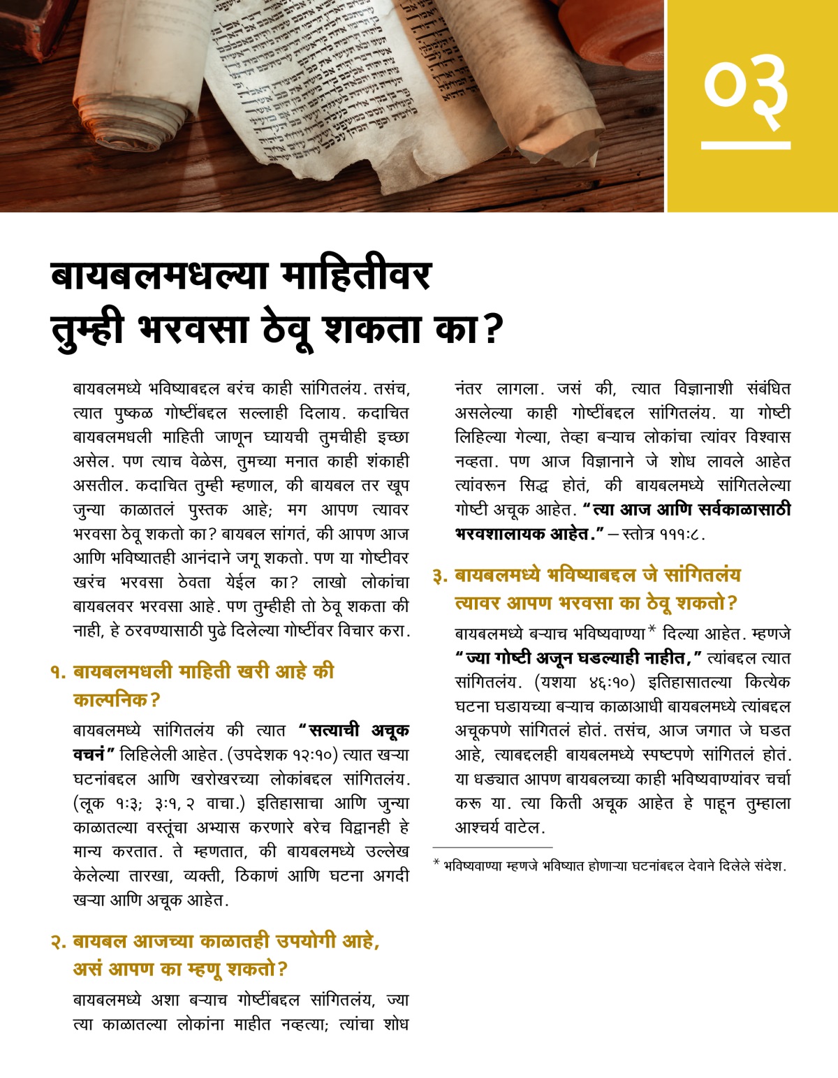 बायबलमध्ये भविष्याबद्दल बरंच काही सांगितलंय. तसंच, त्यात पुष्कळ गोष्टींबद्दल सल्लाही दिलाय. कदाचित बायबलमधली माहिती जाणून घ्यायची तुमचीही इच्छा असेल. पण त्याच वेळेस, तुमच्या मनात काही शंकाही असतील. कदाचित तुम्ही म्हणाल, की बायबल तर खूप जुन्या काळातलं पुस्तक आहे; मग आपण त्यावर भरवसा ठेवू शकतो का? बायबल सांगतं, की आपण आज आणि भविष्यातही आनंदाने जगू शकतो. पण या गोष्टीवर खरंच भरवसा ठेवता येईल का? लाखो लोकांचा बायबलवर भरवसा आहे. पण तुम्हीही तो ठेवू शकता की नाही, हे ठरवण्यासाठी पुढे दिलेल्या गोष्टींवर विचार करा.
