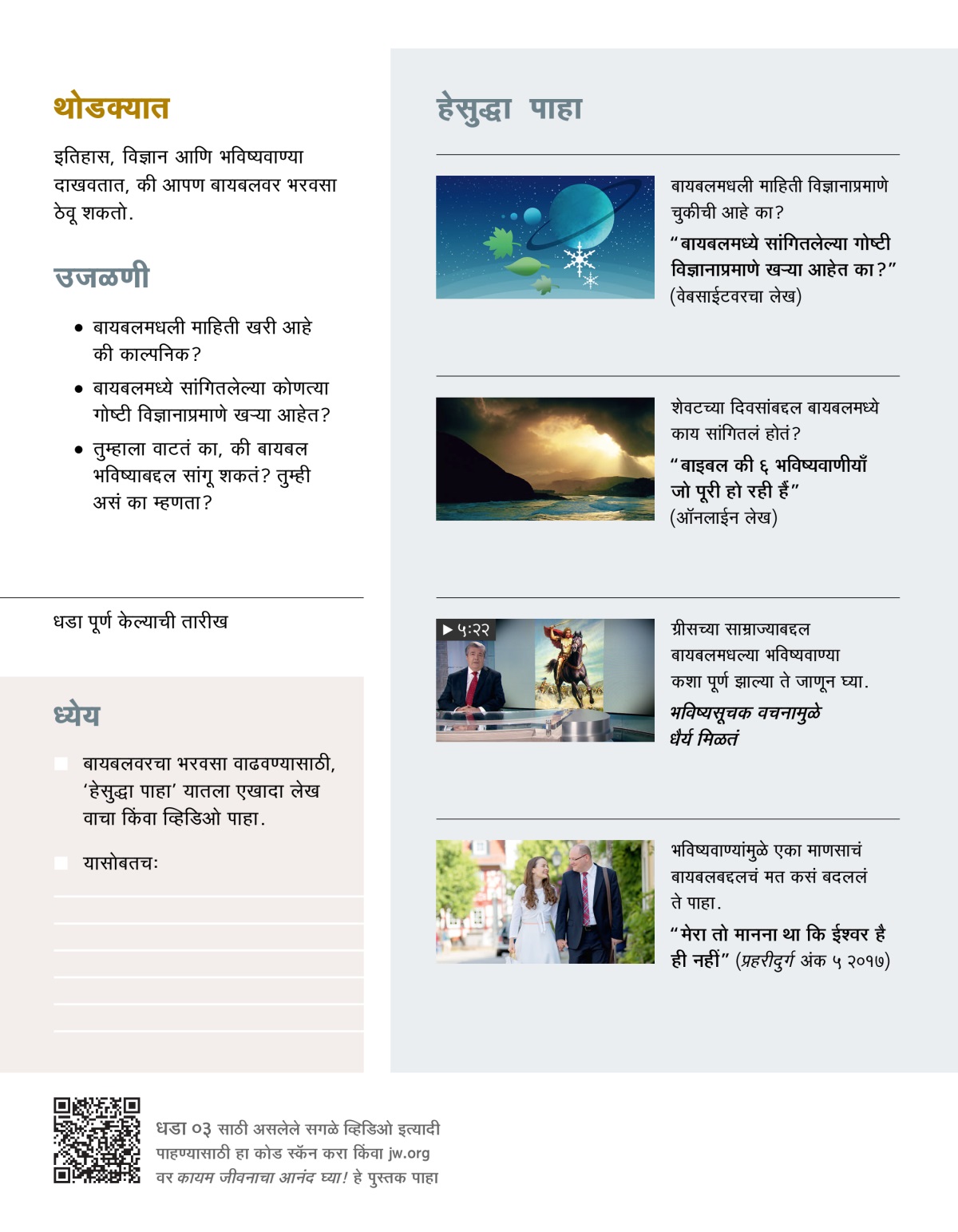 बायबलमध्ये बऱ्याच भविष्यवाण्याa दिल्या आहेत. म्हणजे “ज्या गोष्टी अजून घडल्याही नाहीत,” त्यांबद्दल त्यात सांगितलंय. (यशया ४६:१०) इतिहासातल्या कित्येक घटना घडायच्या बऱ्याच काळाआधी बायबलमध्ये त्यांबद्दल अचूकपणे सांगितलं होतं. तसंच, आज जगात जे घडत आहे, त्याबद्दलही बायबलमध्ये स्पष्टपणे सांगितलं होतं. या धड्यात आपण बायबलच्या काही भविष्यवाण्यांवर चर्चा करू या. त्या किती अचूक आहेत हे पाहून तुम्हाला आश्चर्य वाटेल.