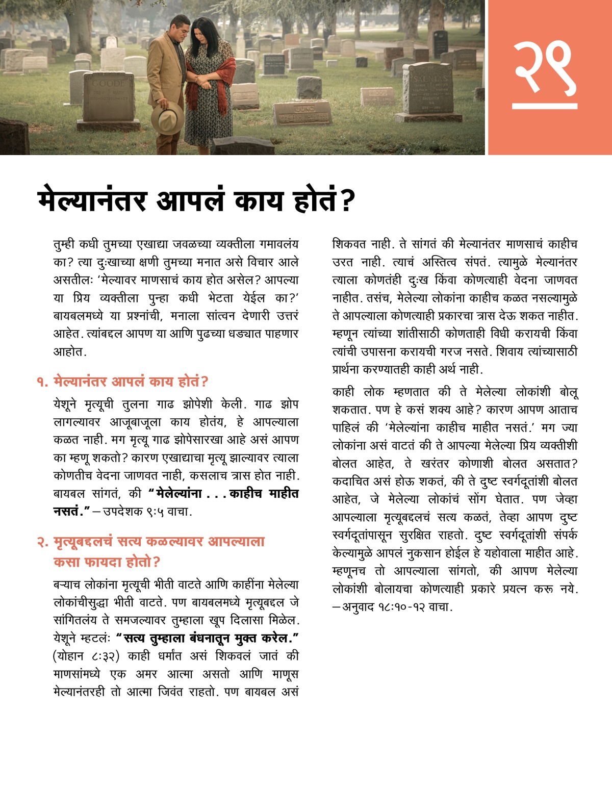 तुम्ही कधी तुमच्या एखाद्या जवळच्या व्यक्तीला गमावलंय का? त्या दुःखाच्या क्षणी तुमच्या मनात असे विचार आले असतील: ‘मेल्यावर माणसाचं काय होत असेल? आपल्या या प्रिय व्यक्तीला पुन्हा कधी भेटता येईल का?’ बायबलमध्ये या प्रश्नांची, मनाला सांत्वन देणारी उत्तरं आहेत. त्यांबद्दल आपण या आणि पुढच्या धड्यात पाहणार आहोत.