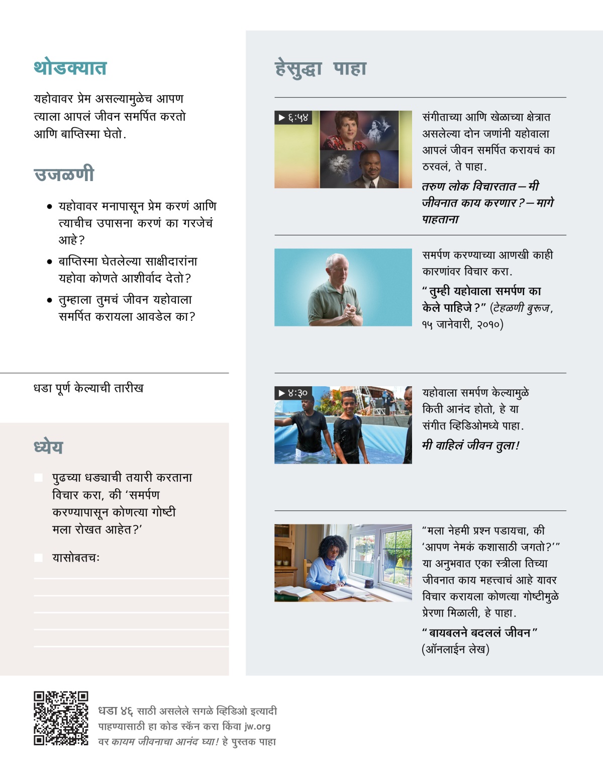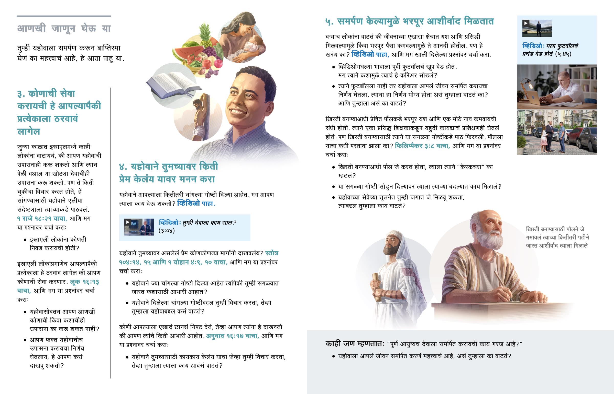 तुम्ही यहोवाला समर्पण करता तेव्हा तुम्ही प्रार्थनेत त्याला सांगता, की तुम्ही फक्त त्याचीच उपासना कराल आणि जीवनात नेहमी त्यालाच पहिलं स्थान द्याल. (स्तोत्र ४०:८) यानंतर तुम्ही बाप्तिस्मा घेता. असं करून तुम्ही इतरांना दाखवता की तुम्ही समर्पण केलं आहे. यहोवाला आपलं जीवन समर्पित करण्याचा निर्णय हा आपल्या जीवनातला सगळ्यात महत्त्वाचा निर्णय आहे. पण जीवन बदलून टाकणारा हा महत्त्वाचा निर्णय तुम्ही कशामुळे घेऊ शकाल?