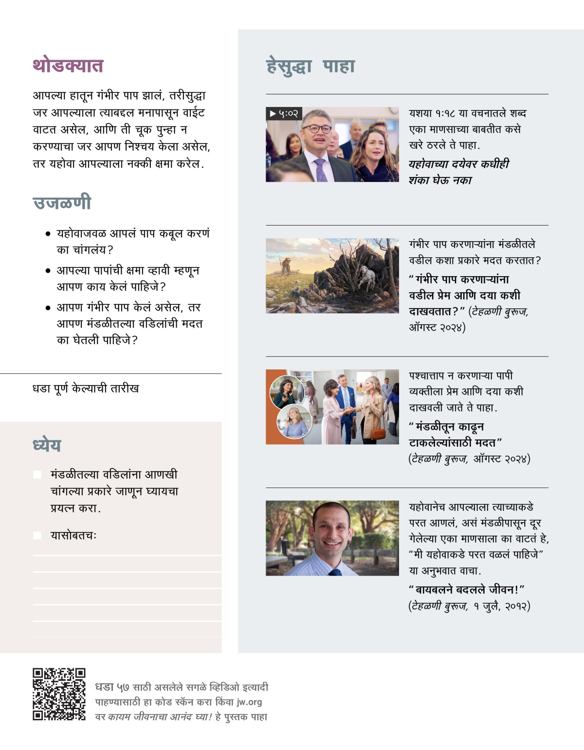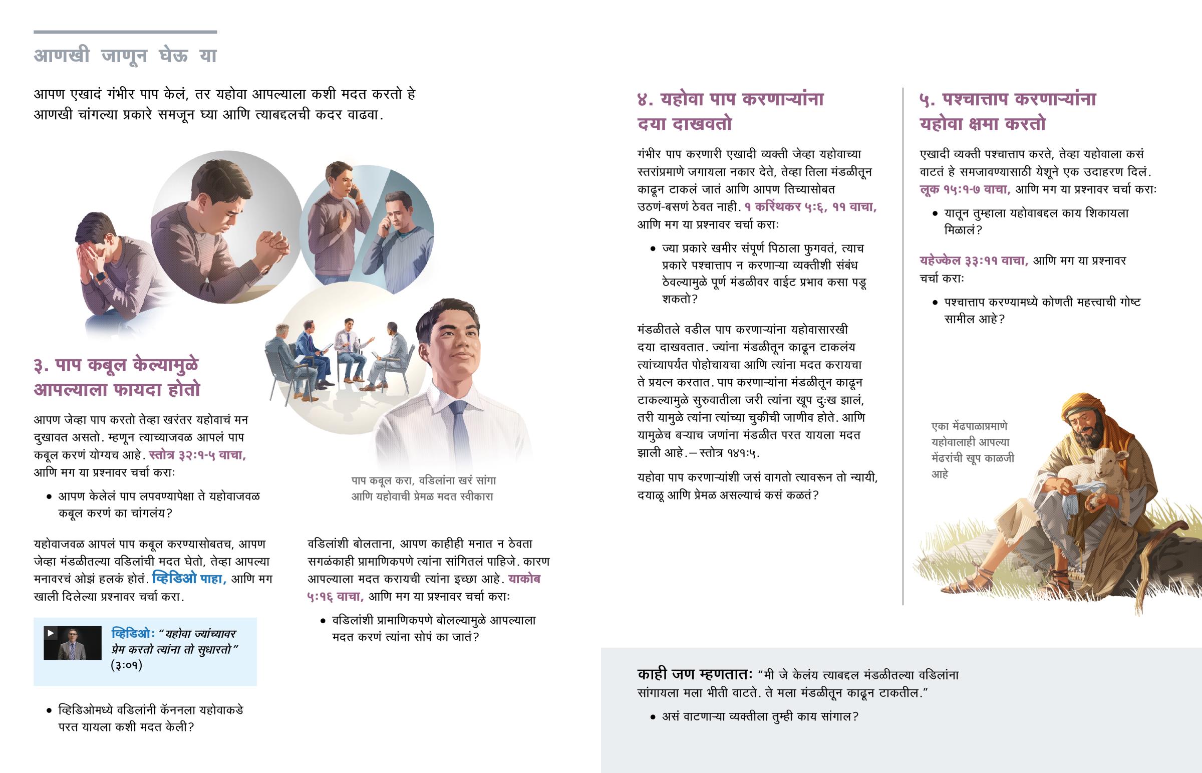 यहोवाजवळ आपलं पाप कबूल करण्यासोबतच, आपण जेव्हा मंडळीतल्या वडिलांची मदत घेतो, तेव्हा आपल्या मनावरचं ओझं हलकं होतं. व्हिडिओ पाहा, आणि मग खाली दिलेल्या प्रश्नावर चर्चा करा.