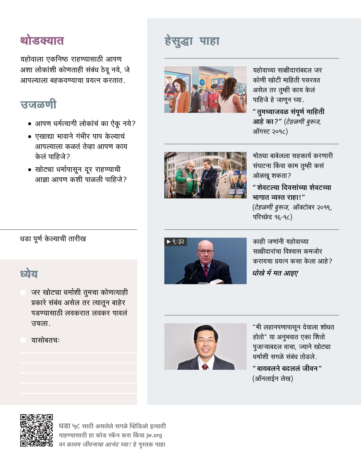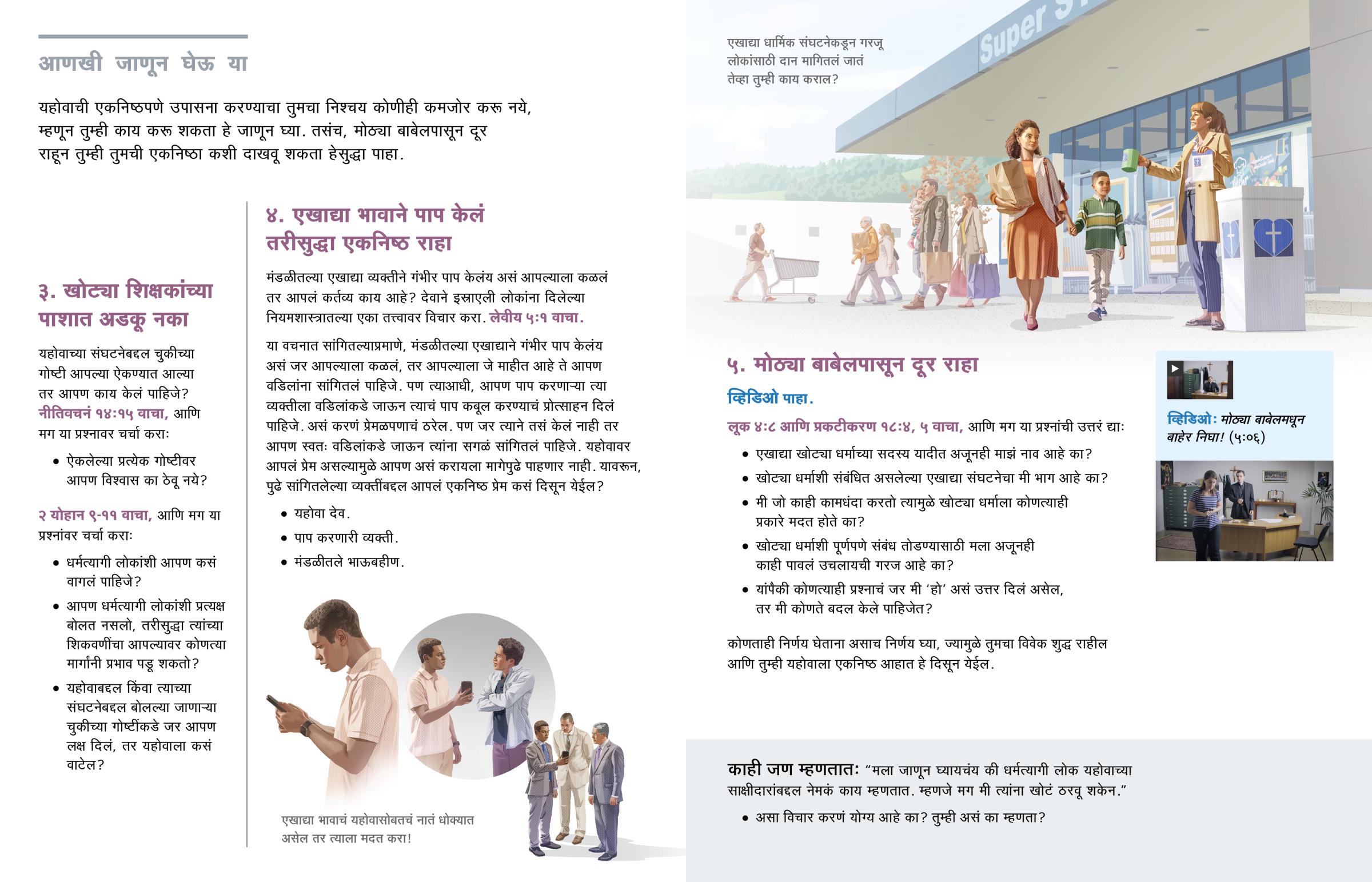 यहोवावर प्रेम असल्यामुळेच आपण खोट्या धर्माशी कोणताही संबंध ठेवत नाही. आपण जो नोकरी-धंदा निवडतो, ज्या संस्थांचा भाग बनतो किंवा जे काही करायचा निर्णय घेतो, त्यांपैकी कशाचाही खोट्या धर्माशी संबंध नाही याची आपण खातरी केली पाहिजे. यहोवा आपल्याला स्पष्टपणे सांगतो, ‘माझ्या लोकांनो, [मोठ्या बाबेलमधून] बाहेर या.’—प्रकटीकरण १८:२, ४.