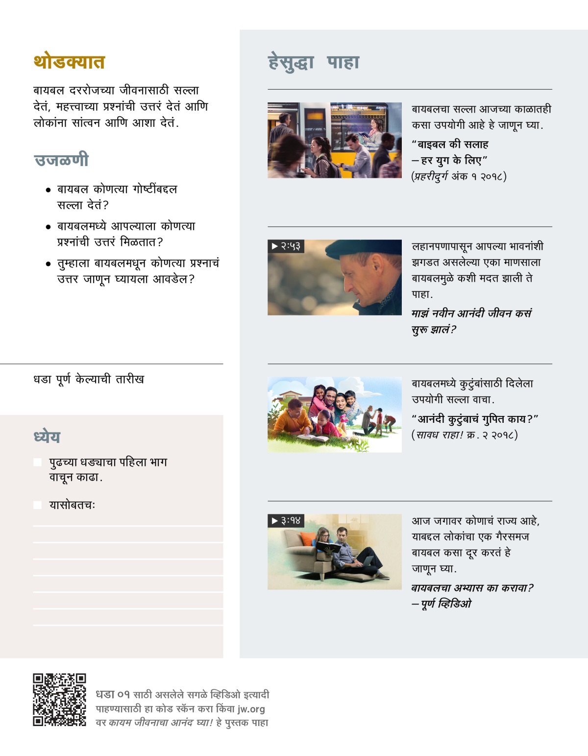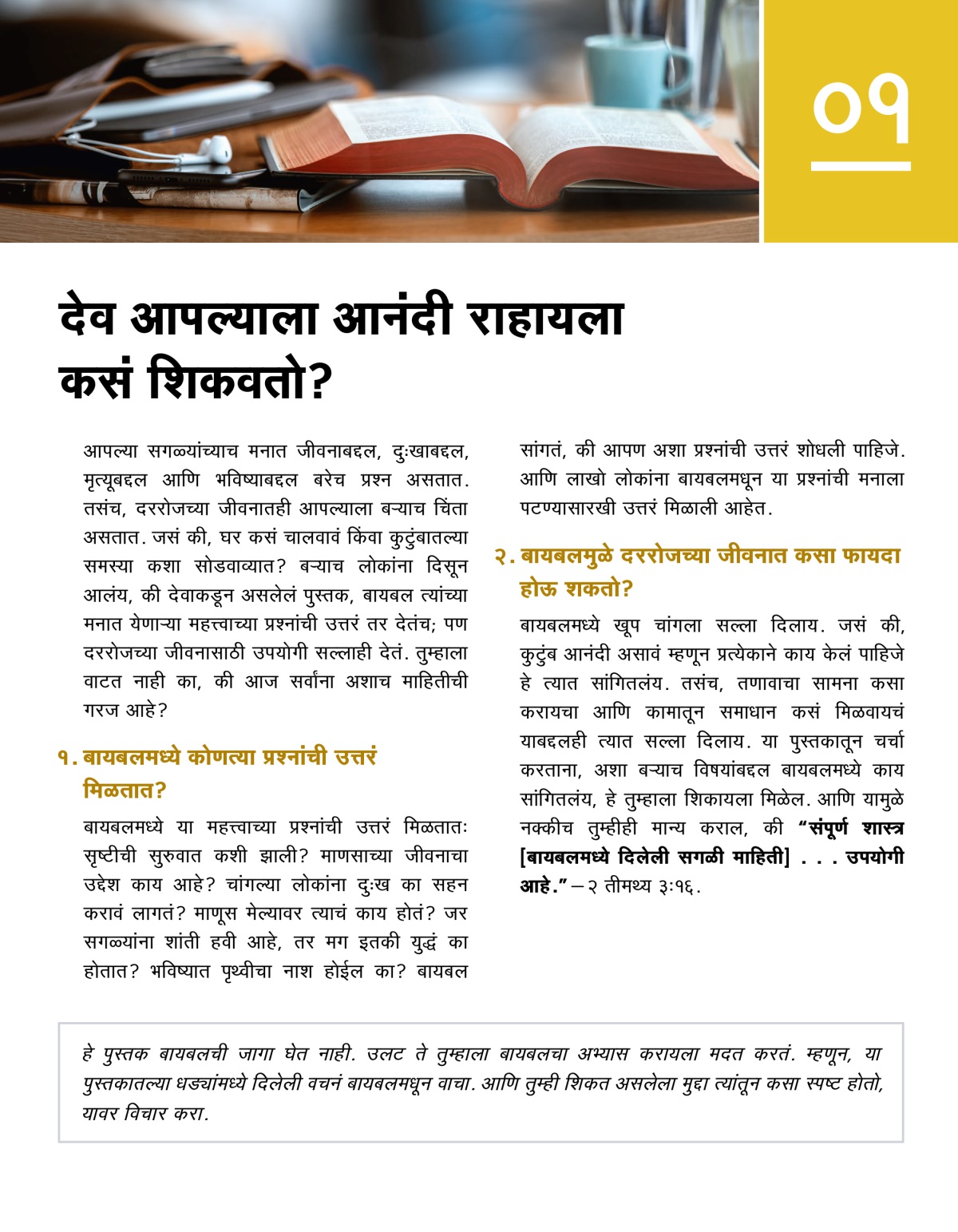 आपल्या सगळ्यांच्याच मनात जीवनाबद्दल, दुःखाबद्दल, मृत्यूबद्दल आणि भविष्याबद्दल बरेच प्रश्न असतात. तसंच, दररोजच्या जीवनातही आपल्याला बऱ्याच चिंता असतात. जसं की, घर कसं चालवावं किंवा कुटुंबातल्या समस्या कशा सोडवाव्यात? बऱ्याच लोकांना दिसून आलंय, की देवाकडून असलेलं पुस्तक, बायबल त्यांच्या मनात येणाऱ्या महत्त्वाच्या प्रश्नांची उत्तरं तर देतंच; पण दररोजच्या जीवनासाठी उपयोगी सल्लाही देतं. तुम्हाला वाटत नाही का, की आज सर्वांना अशाच माहितीची गरज आहे?