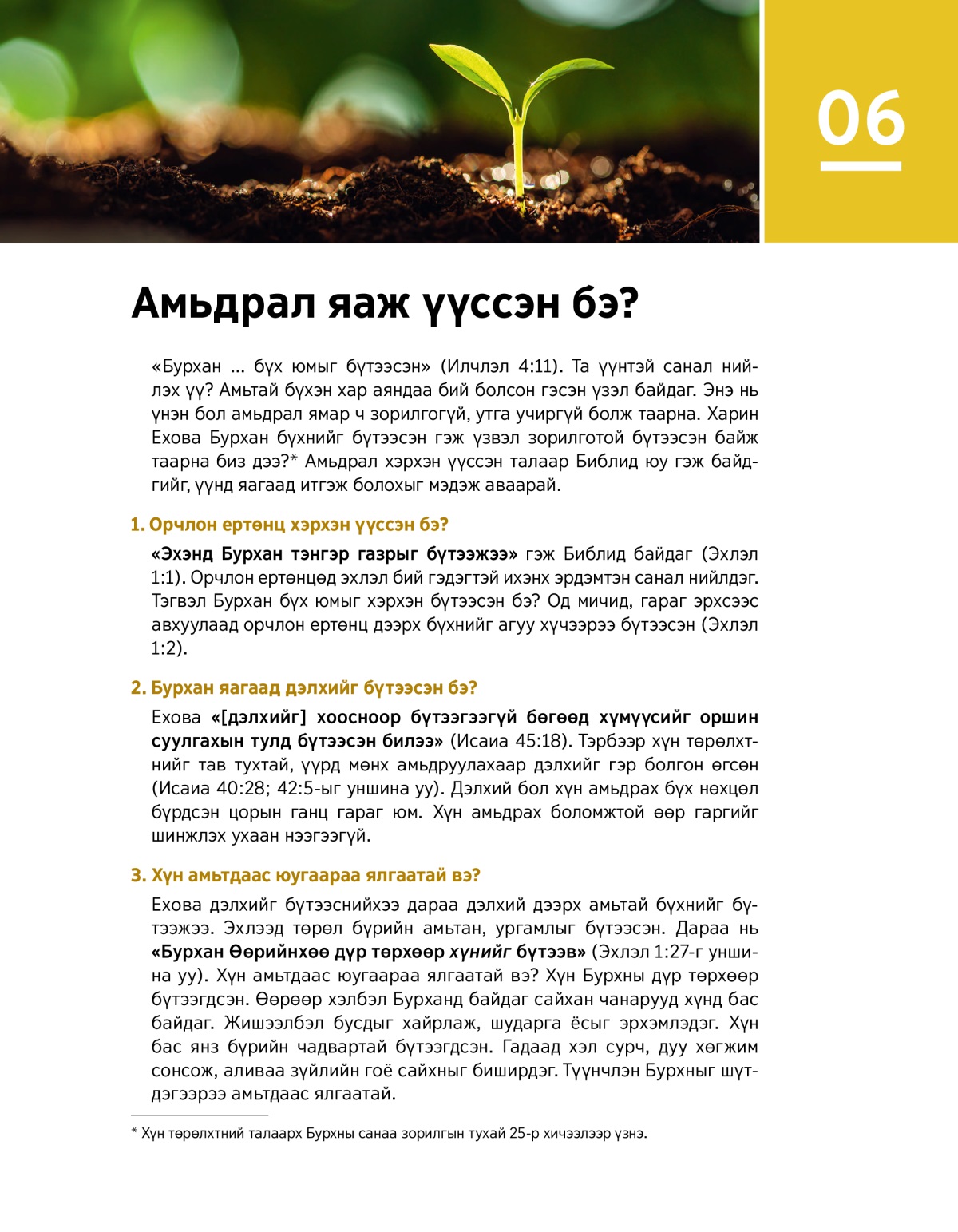 «Бурхан ... бүх юмыг бүтээсэн» (Илчлэл 4:11). Та үүнтэй санал нийлэх үү? Амьтай бүхэн хар аяндаа бий болсон гэсэн үзэл байдаг. Энэ нь үнэн бол амьдрал ямар ч зорилгогүй, утга учиргүй болж таарна. Харин Ехова Бурхан бүхнийг бүтээсэн гэж үзвэл зорилготой бүтээсэн байж таарна биз дээ?a Амьдрал хэрхэн үүссэн талаар Библид юу гэж байдгийг, үүнд яагаад итгэж болохыг мэдэж аваарай.