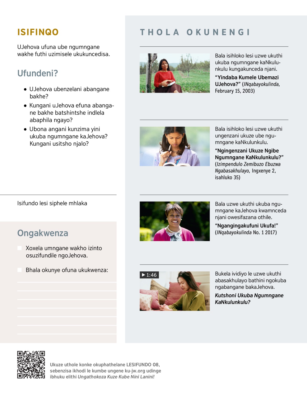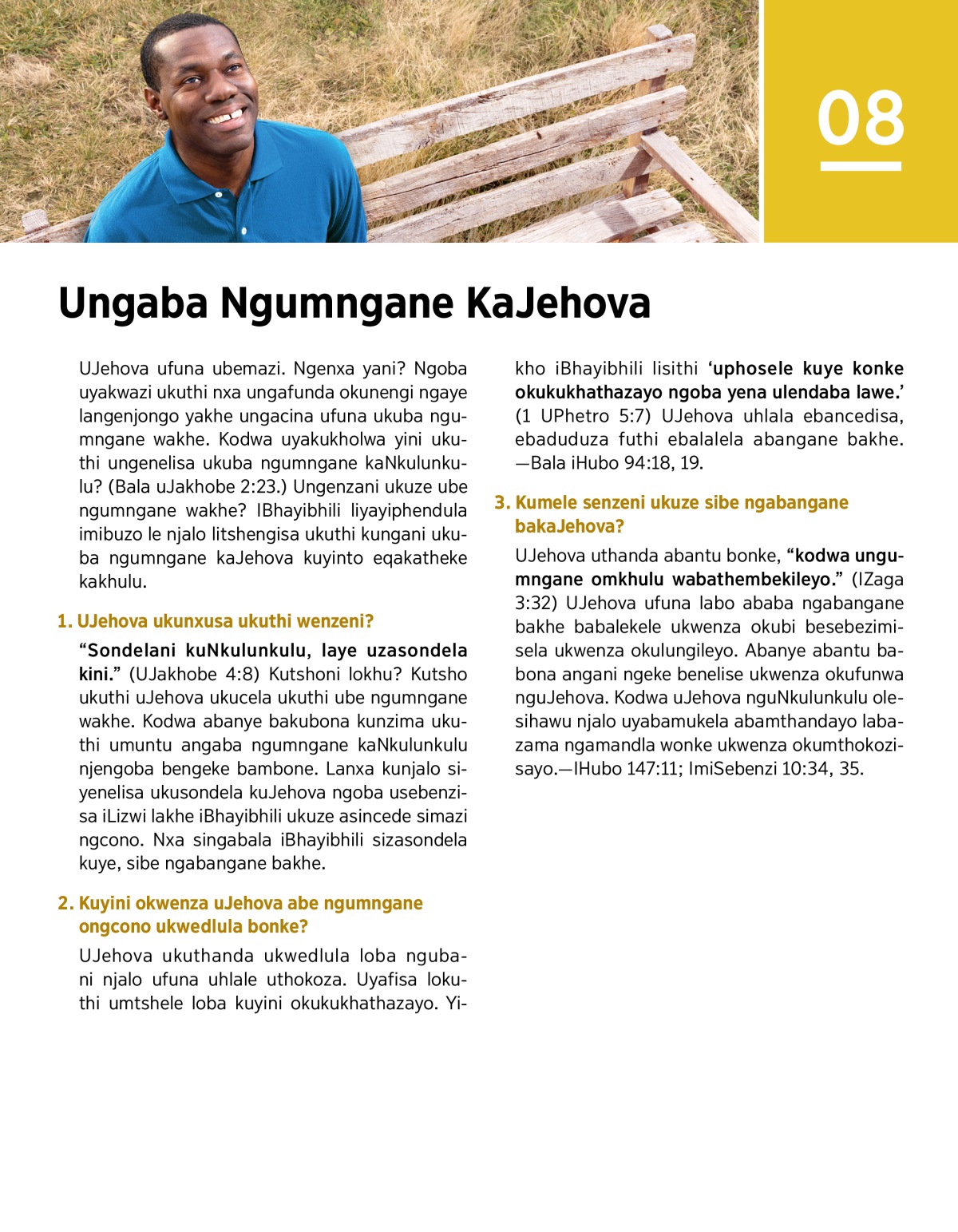 UJehova ufuna ubemazi. Ngenxa yani? Ngoba uyakwazi ukuthi nxa ungafunda okunengi ngaye langenjongo yakhe ungacina ufuna ukuba ngumngane wakhe. Kodwa uyakukholwa yini ukuthi ungenelisa ukuba ngumngane kaNkulunkulu? (Bala uJakhobe 2:23.) Ungenzani ukuze ube ngumngane wakhe? IBhayibhili liyayiphendula imibuzo le njalo litshengisa ukuthi kungani ukuba ngumngane kaJehova kuyinto eqakatheke kakhulu.