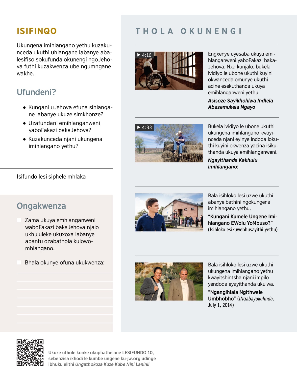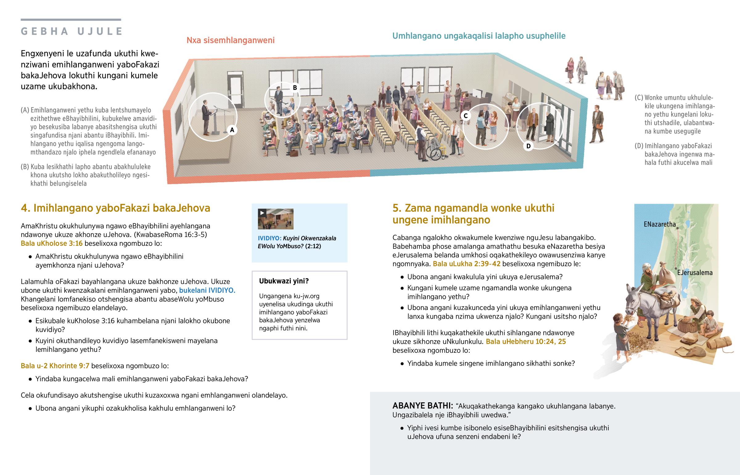 Sewake waya emihlanganweni yaboFakazi bakaJehova yini? Mhlawumbe uyafisa ukwenza njalo kodwa uyesaba. Ungabe uzibuza ukuthi: ‘Kwenziwani emihlanganweni leyo? Yindaba kuqakathekile ukuthi ngiyingene?’ Esifundweni lesi uzabona ukuthi ukuhlangana labanye kuzakunceda kakhulu njalo kukwenze usondele kuNkulunkulu.