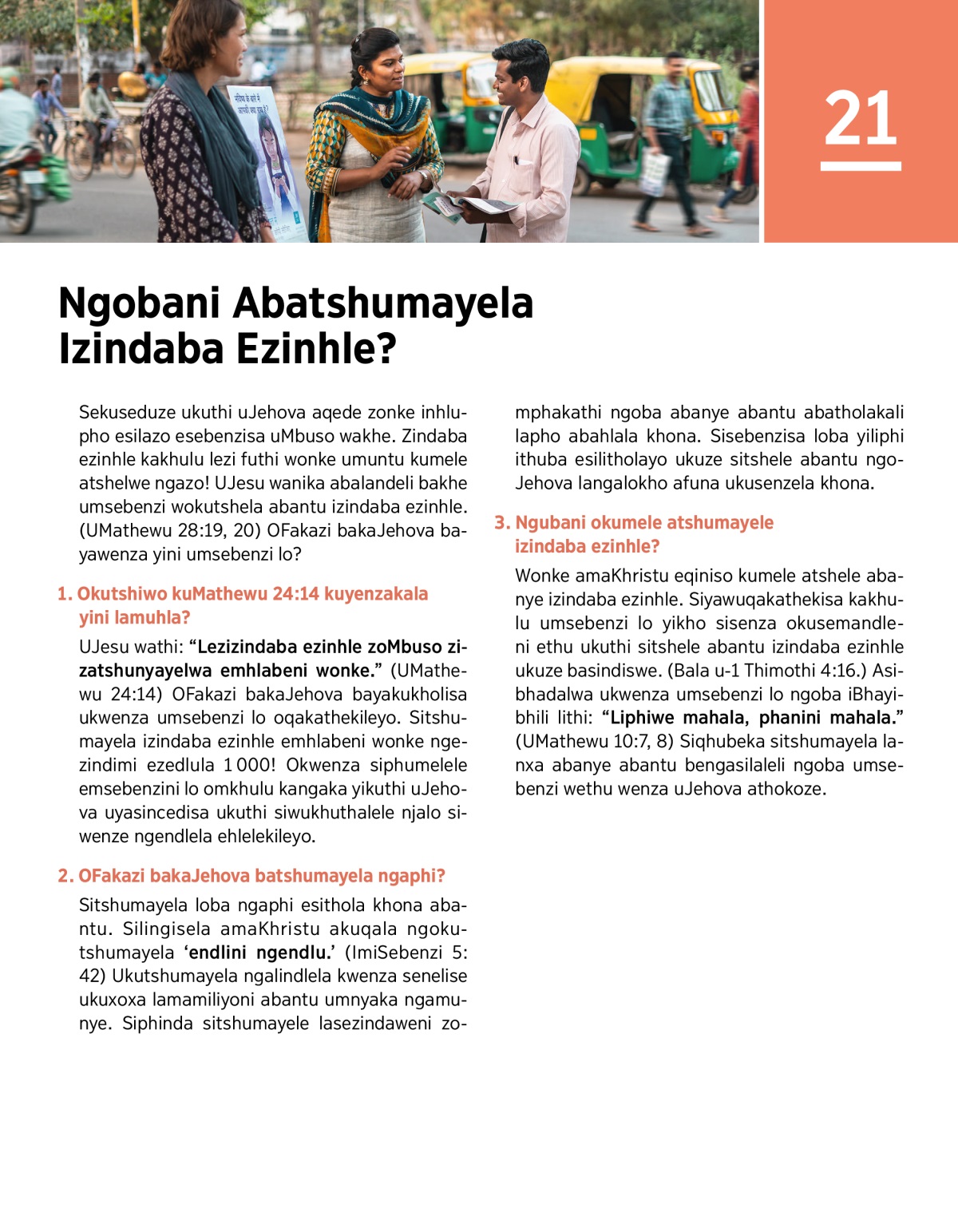 UJesu wathi: “Lezizindaba ezinhle zoMbuso zizatshunyayelwa emhlabeni wonke.” (UMathewu 24:14) OFakazi bakaJehova bayakukholisa ukwenza umsebenzi lo oqakathekileyo. Sitshumayela izindaba ezinhle emhlabeni wonke ngezindimi ezedlula 1 000! Okwenza siphumelele emsebenzini lo omkhulu kangaka yikuthi uJehova uyasincedisa ukuthi siwukhuthalele njalo siwenze ngendlela ehlelekileyo.