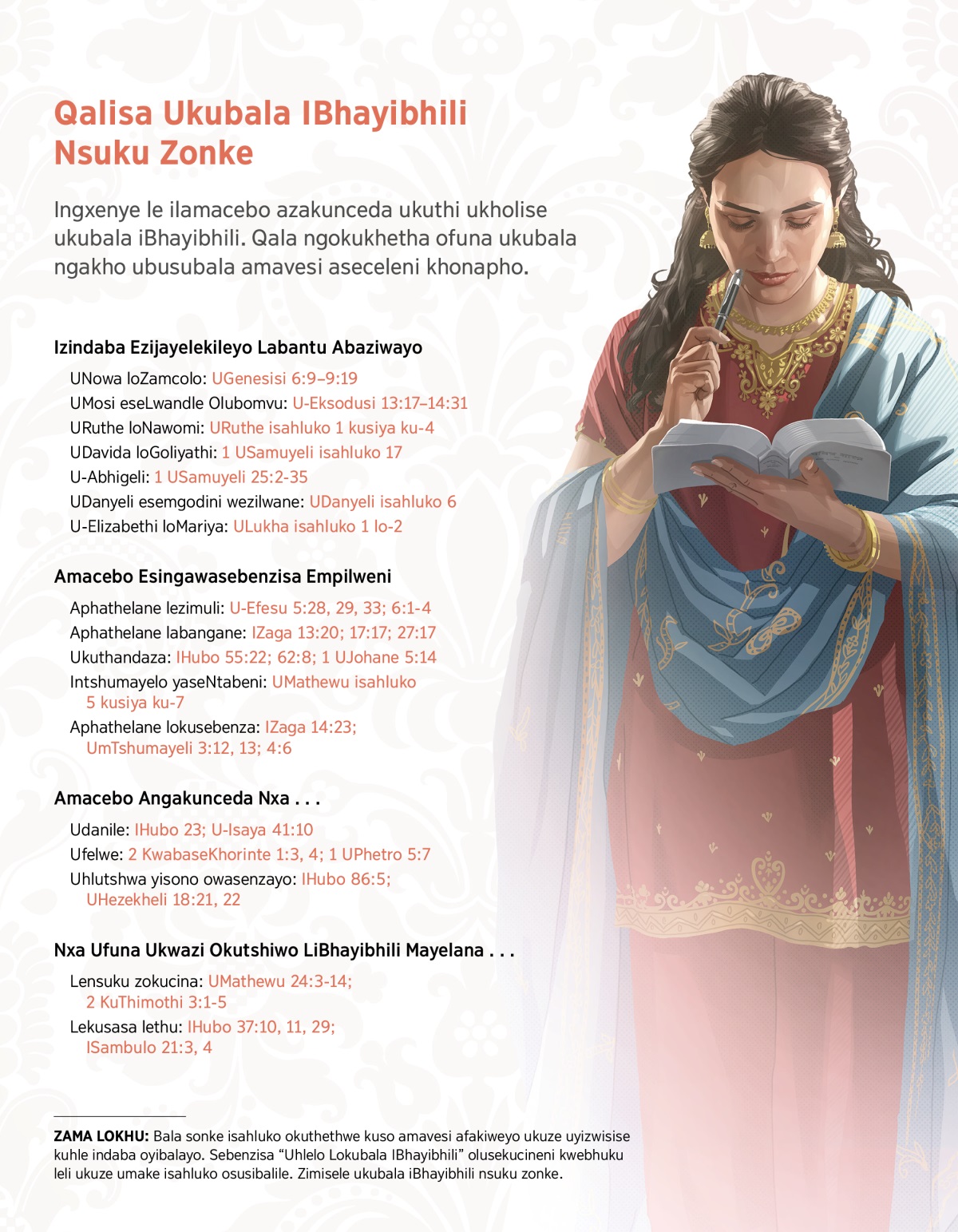 ZAMA LOKHU: Bala sonke isahluko okuthethwe kuso amavesi afakiweyo ukuze uyizwisise kuhle indaba oyibalayo. Sebenzisa “Uhlelo Lokubala IBhayibhili” olusekucineni kwebhuku leli ukuze umake isahluko osusibalile. Zimisele ukubala iBhayibhili nsuku zonke.
