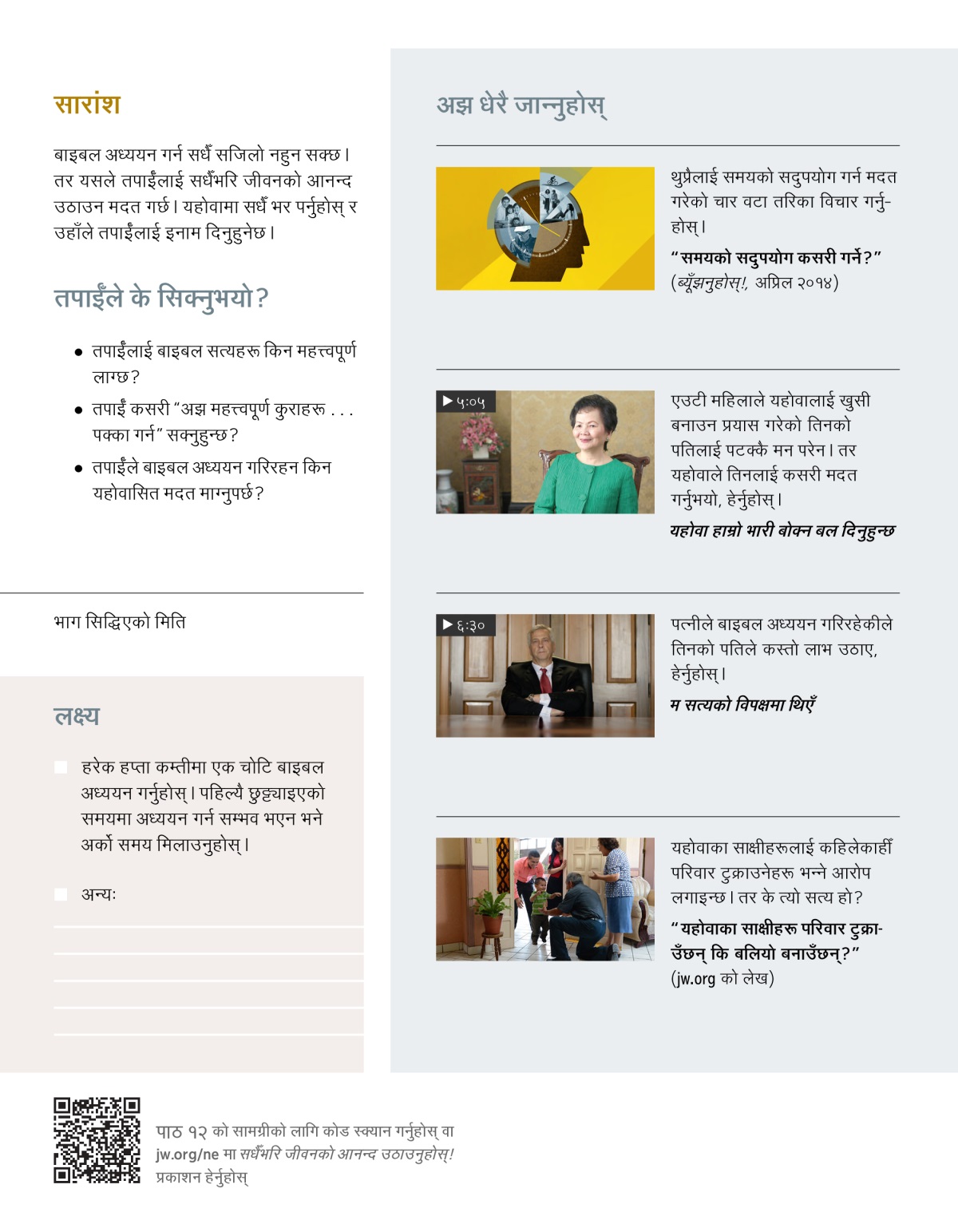 तपाईँ व्यस्त तालिका वा विरोधको बाबजुद कसरी बाइबल अध्ययन गरिरहन सक्नुहुन्छ, बुझ्नुहोस्। साथै यहोवाले तपाईँलाई बाइबल अध्ययन गरिरहन कसरी मदत गर्नुहुनेछ, विचार गर्नुहोस्।