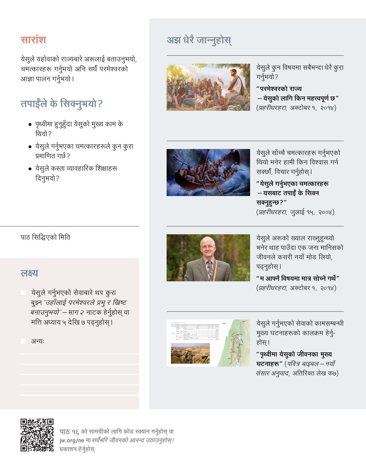 येसुबारे सुन्दा कसै-कसैको मनमा एउटा निस्सहाय बालकको चित्र आउँछ। कोही-कोही उहाँ बुद्धिमान् भविष्यवक्ता हुनुहुन्थ्यो भन्छन् भने कसै-कसैको दिमागमा चाहिँ मर्नै लागेको मानिसको चित्र आउँछ। पृथ्वीमा हुनुहुँदा उहाँले गर्नुभएका कामहरू केलायौँ भने के हामी उहाँबारे अझ धेरै सिक्न सक्छौँ? यस लेखमा हामी येसुले गर्नुभएका केही असाध्यै महत्त्वपूर्ण कामबारे थाह पाउनेछौँ। साथै त्यसले तपाईँको जीवनमा कस्तो प्रभाव पार्छ, त्यो पनि बुझ्नेछौँ।