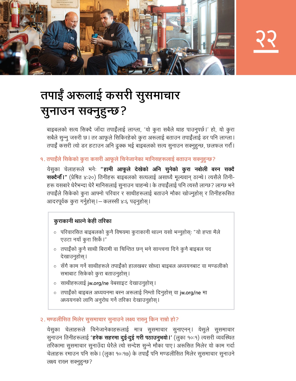 बाइबलको सत्य सिक्दै जाँदा तपाईँलाई लाग्ला, ‘यो कुरा सबैले थाह पाउनुपर्छ।’ हो, यो कुरा सबैले सुन्नु जरुरी छ। तर आफूले सिकिरहेको कुरा अरूलाई बताउन तपाईँलाई डर पनि लाग्ला। तपाईँ कसरी त्यो डर हटाउन अनि ढुक्क भई बाइबलको सत्य सुनाउन सक्नुहुन्छ, छलफल गरौँ।