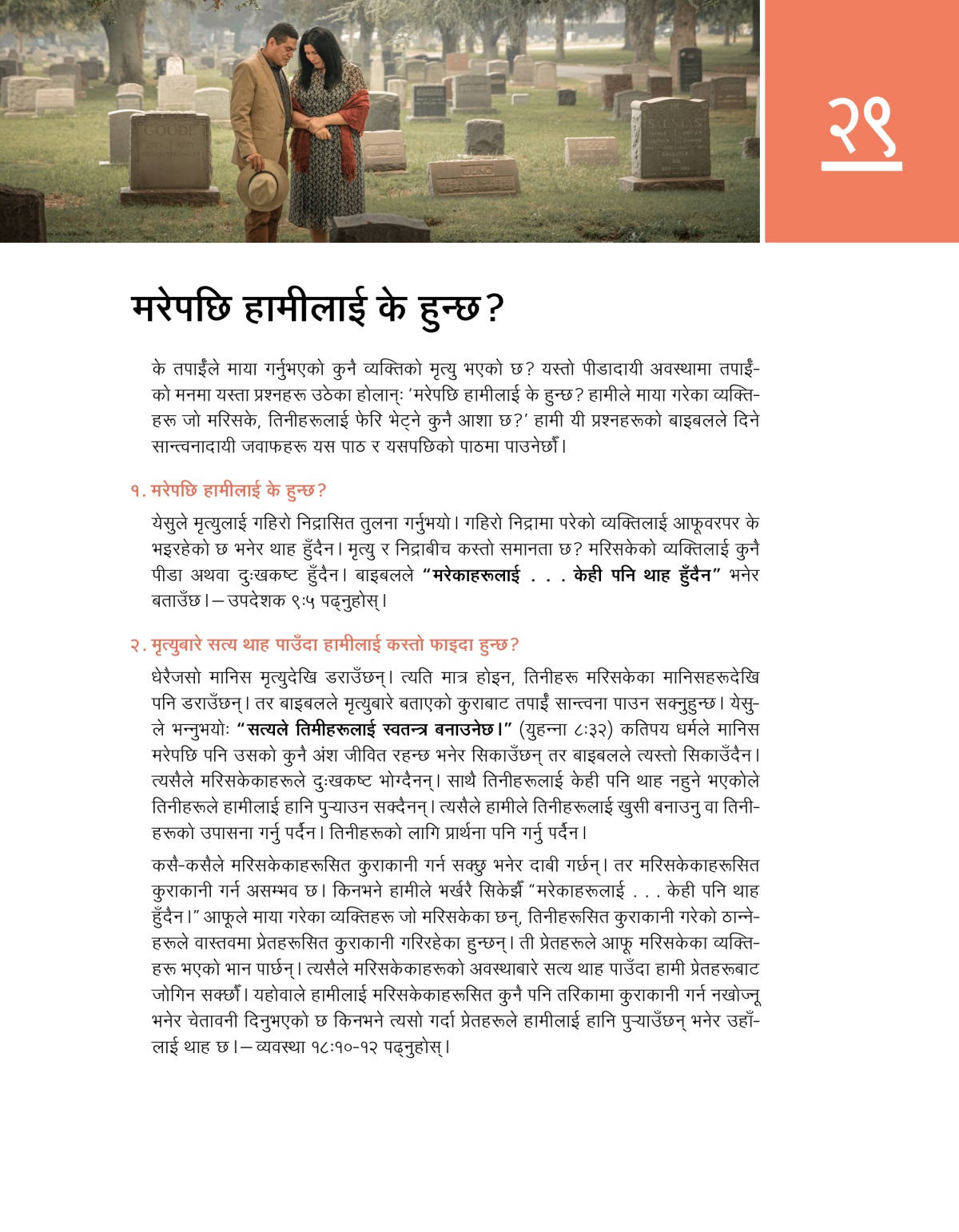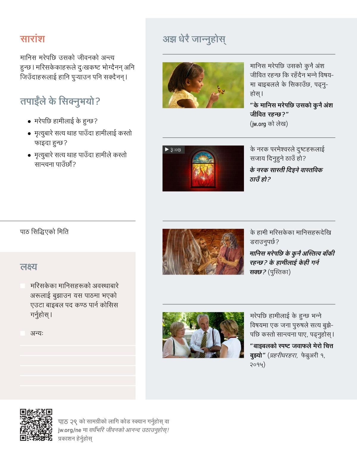 के तपाईँले माया गर्नुभएको कुनै व्यक्तिको मृत्यु भएको छ? यस्तो पीडादायी अवस्थामा तपाईँको मनमा यस्ता प्रश्नहरू उठेका होलान्: ‘मरेपछि हामीलाई के हुन्छ? हामीले माया गरेका व्यक्तिहरू जो मरिसके, तिनीहरूलाई फेरि भेट्ने कुनै आशा छ?’ हामी यी प्रश्नहरूको बाइबलले दिने सान्त्वनादायी जवाफहरू यस पाठ र यसपछिको पाठमा पाउनेछौँ।