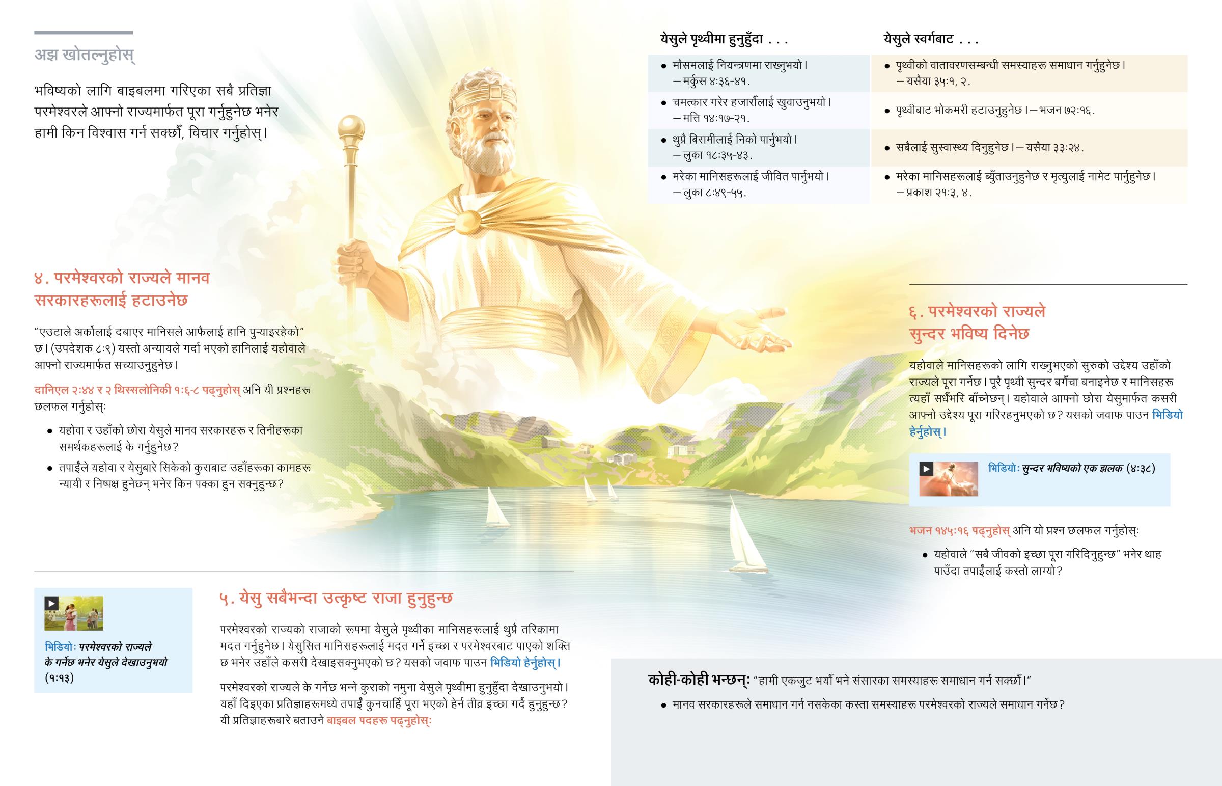 परमेश्वरको राज्यको राजाको रूपमा येसुले पृथ्वीका मानिसहरूलाई थुप्रै तरिकामा मदत गर्नुहुनेछ। येसुसित मानिसहरूलाई मदत गर्ने इच्छा र परमेश्वरबाट पाएको शक्ति छ भनेर उहाँले कसरी देखाइसक्नुभएको छ? यसको जवाफ पाउन भिडियो हेर्नुहोस्।