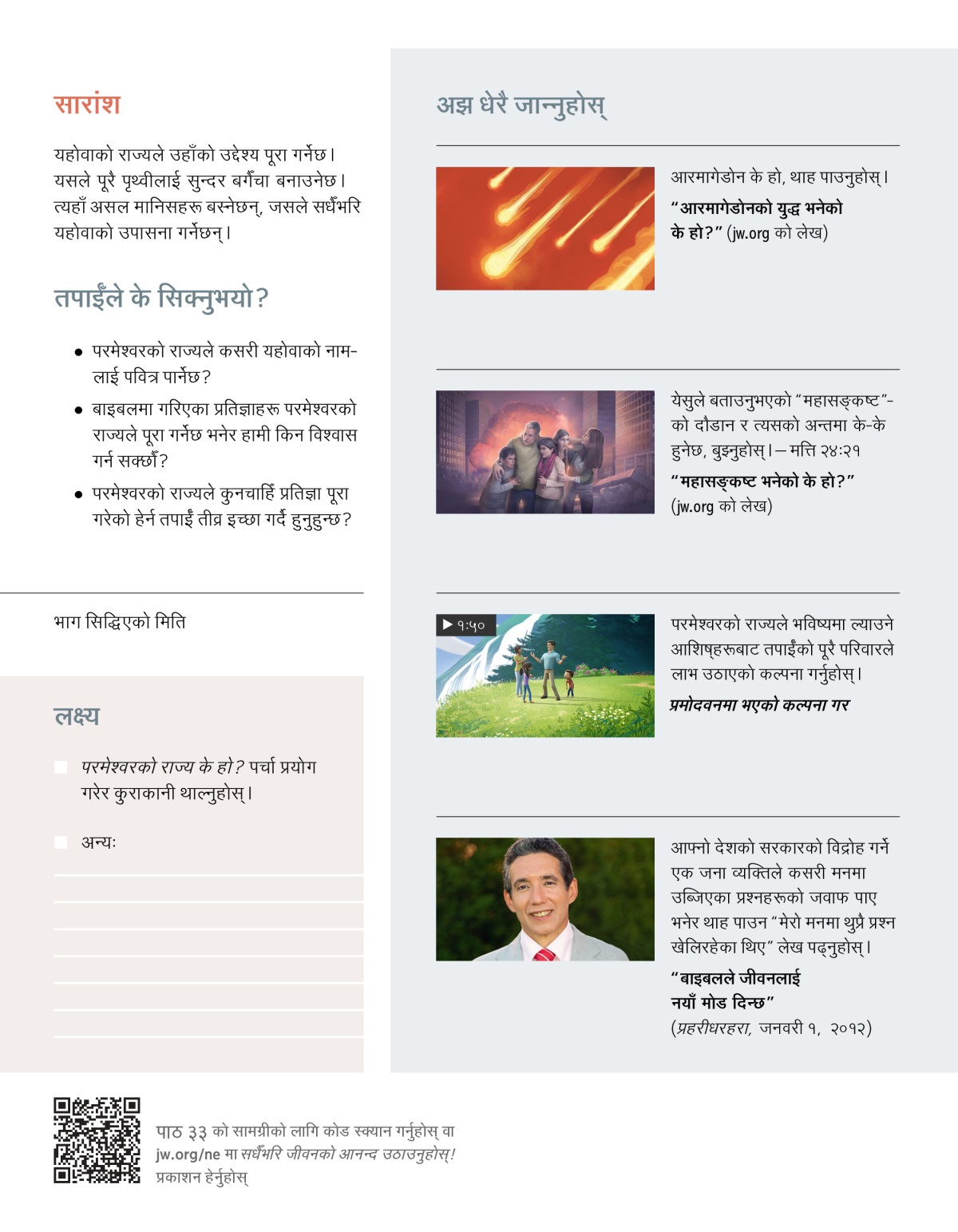 परमेश्वरको राज्यले शासन गर्न थालिसकेको छ। चाँडै यसले पृथ्वीमा ठूलठूला परिवर्तनहरू गर्नेछ। आउनुहोस्, परमेश्वरको राज्यले पृथ्वीमा शासन गर्न थाल्दा तपाईँले अनुभव गर्न सक्ने केही राम्रा कुराहरूबारे छलफल गरौँ।