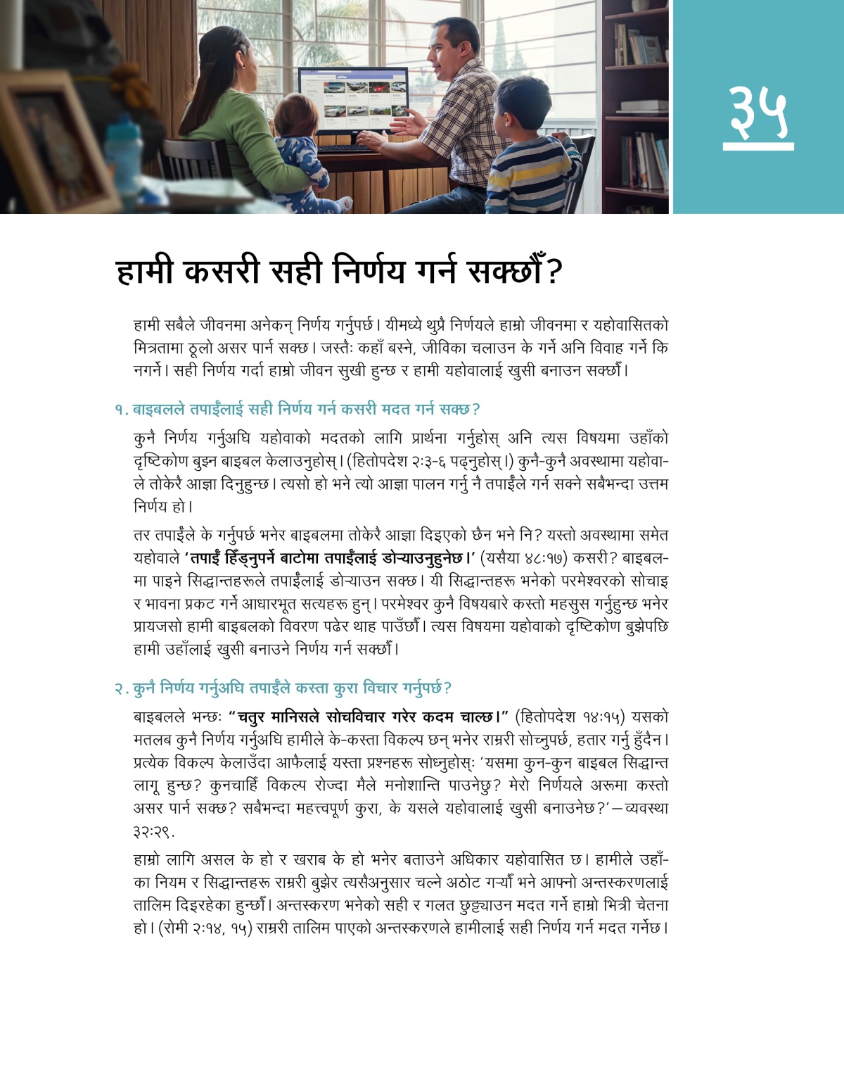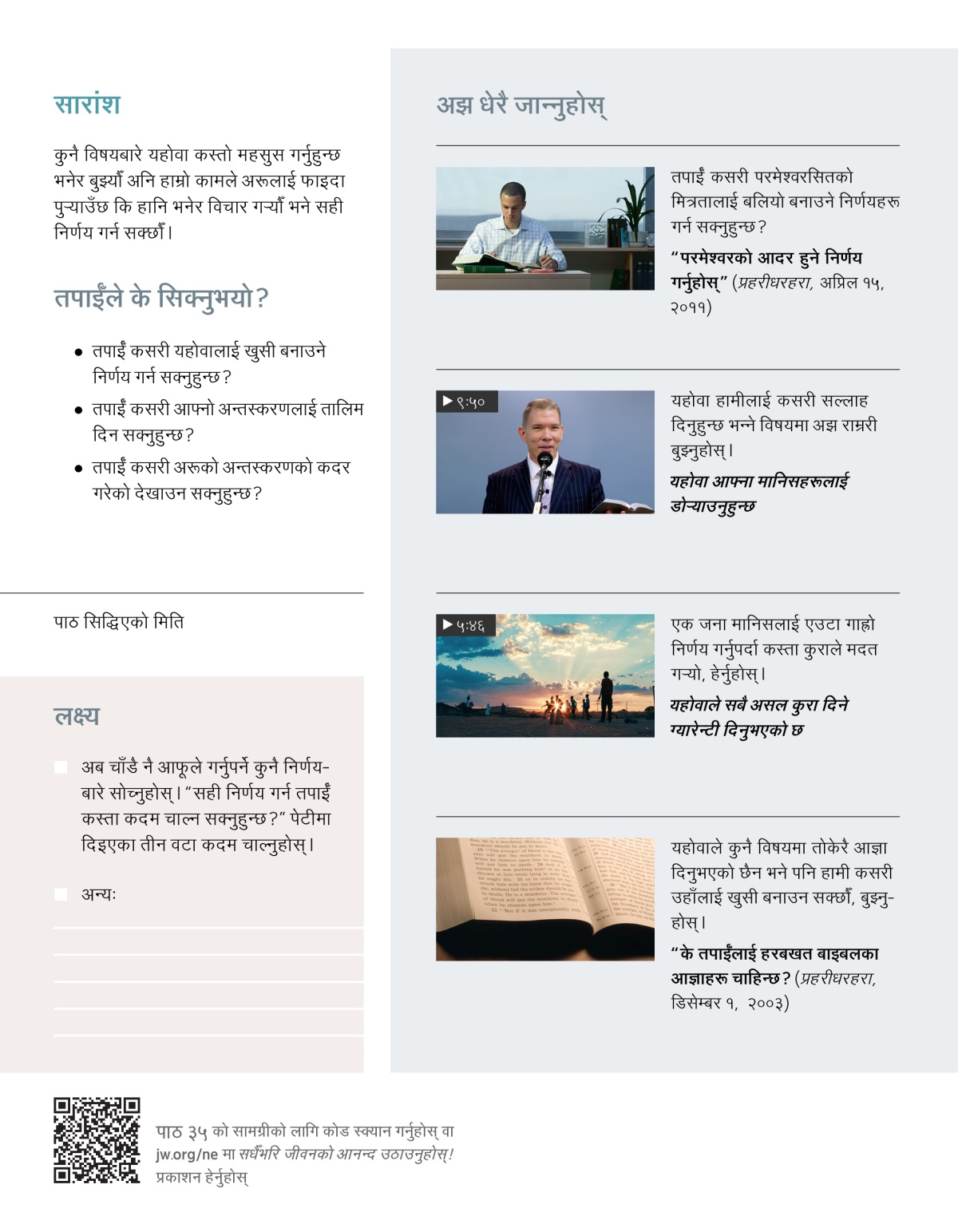 हामी सबैले जीवनमा अनेकन् निर्णय गर्नुपर्छ। यीमध्ये थुप्रै निर्णयले हाम्रो जीवनमा र यहोवासितको मित्रतामा ठूलो असर पार्न सक्छ। जस्तै: कहाँ बस्ने, जीविका चलाउन के गर्ने अनि विवाह गर्ने कि नगर्ने। सही निर्णय गर्दा हाम्रो जीवन सुखी हुन्छ र हामी यहोवालाई खुसी बनाउन सक्छौँ।