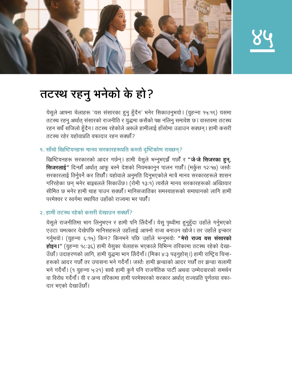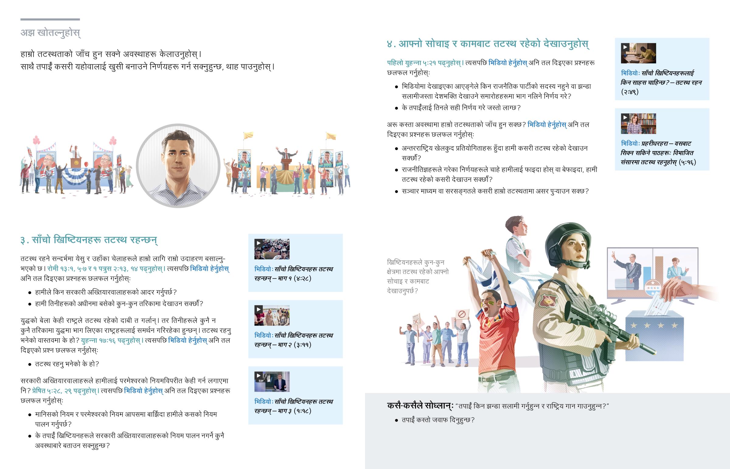 तटस्थ रहने सन्दर्भमा येसु र उहाँका चेलाहरूले हाम्रो लागि राम्रो उदाहरण बसाल्नुभएको छ। रोमी १३:१, ५-७ र १ पत्रुस २:१३, १४ पढ्नुहोस्। त्यसपछि भिडियो हेर्नुहोस् अनि तल दिइएका प्रश्नहरू छलफल गर्नुहोस्: