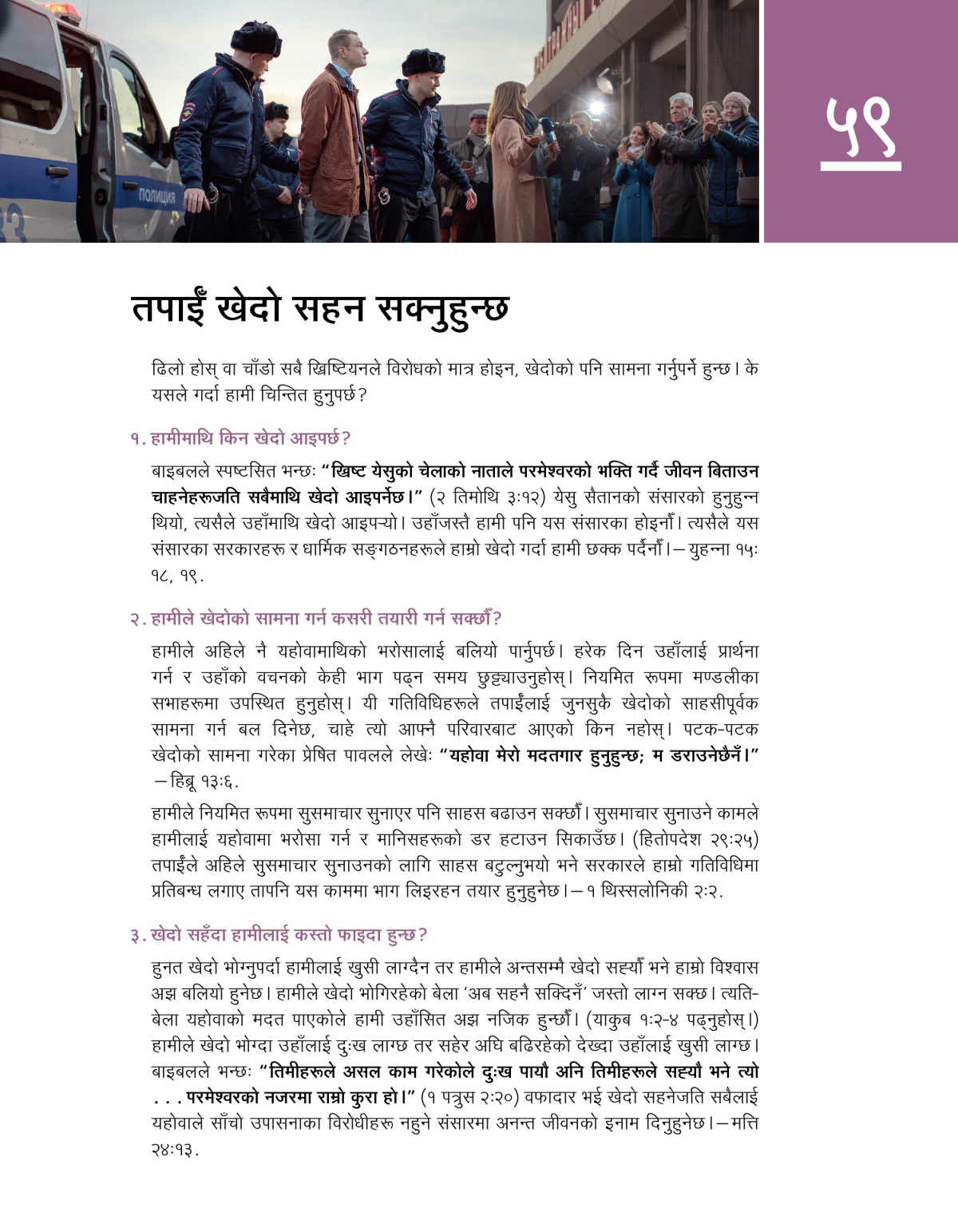 हामीले अहिले नै यहोवामाथिको भरोसालाई बलियो पार्नुपर्छ। हरेक दिन उहाँलाई प्रार्थना गर्न र उहाँको वचनको केही भाग पढ्न समय छुट्ट्याउनुहोस्। नियमित रूपमा मण्डलीका सभाहरूमा उपस्थित हुनुहोस्। यी गतिविधिहरूले तपाईँलाई जुनसुकै खेदोको साहसीपूर्वक सामना गर्न बल दिनेछ, चाहे त्यो आफ्नै परिवारबाट आएको किन नहोस्। पटक-पटक खेदोको सामना गरेका प्रेषित पावलले लेखे: “यहोवा मेरो मदतगार हुनुहुन्छ; म डराउनेछैनँ।”—हिब्रू १३:६.